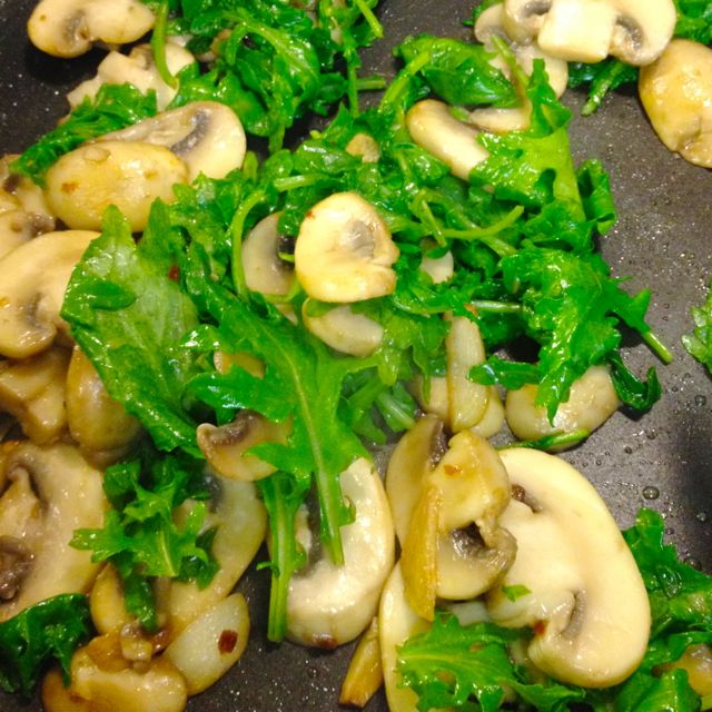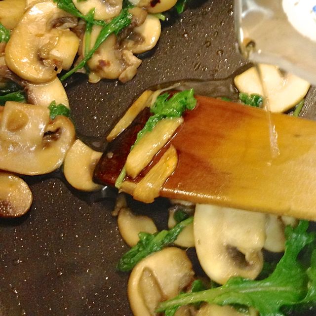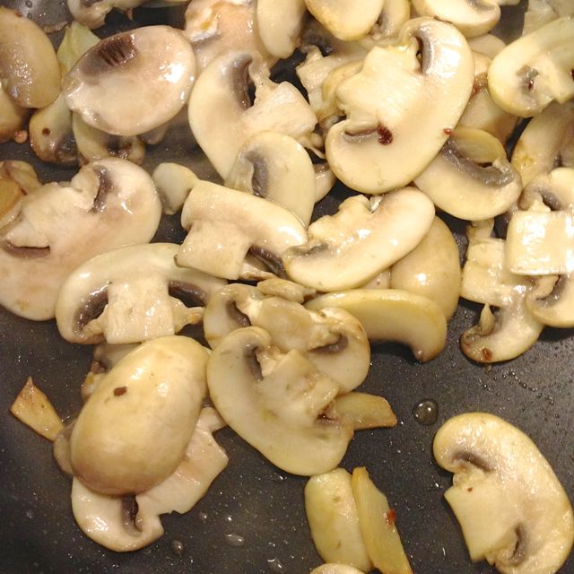 Add in the mushrooms and a pinch of salt, and cook until the mushrooms start to sweat ( I prefer “weep”) and turn golden, about 6 minutes.