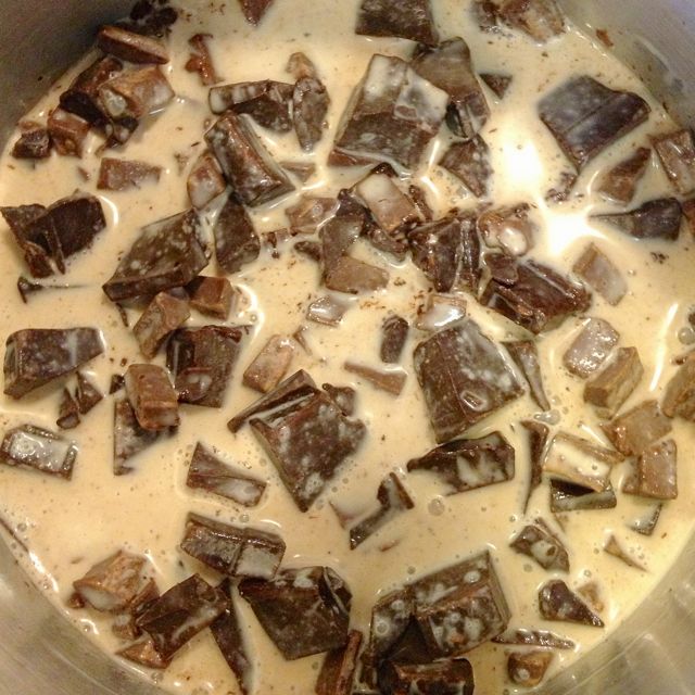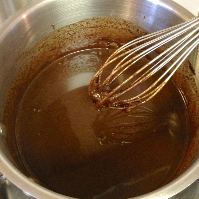Over medium-low heat, whisk the mixture until smooth, and all the chocolate has melted.