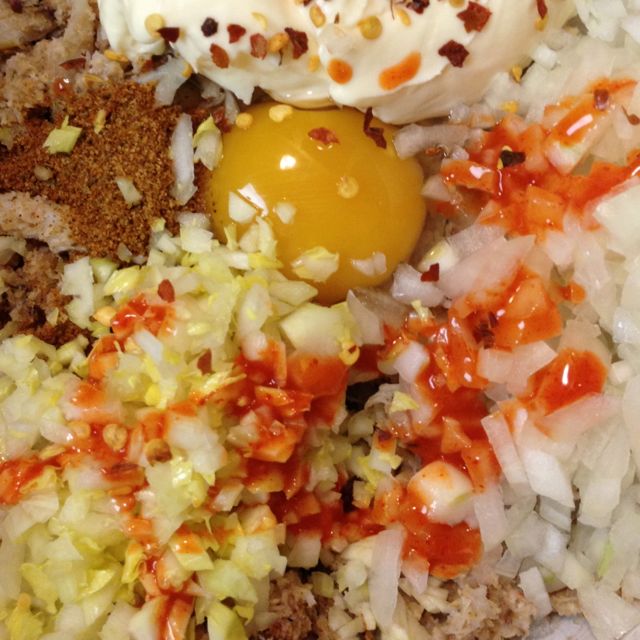 To the breadcrumbs and crab, add the chili flakes, egg, chopped onion & celery, garlic, seasoning, and hot sauce.