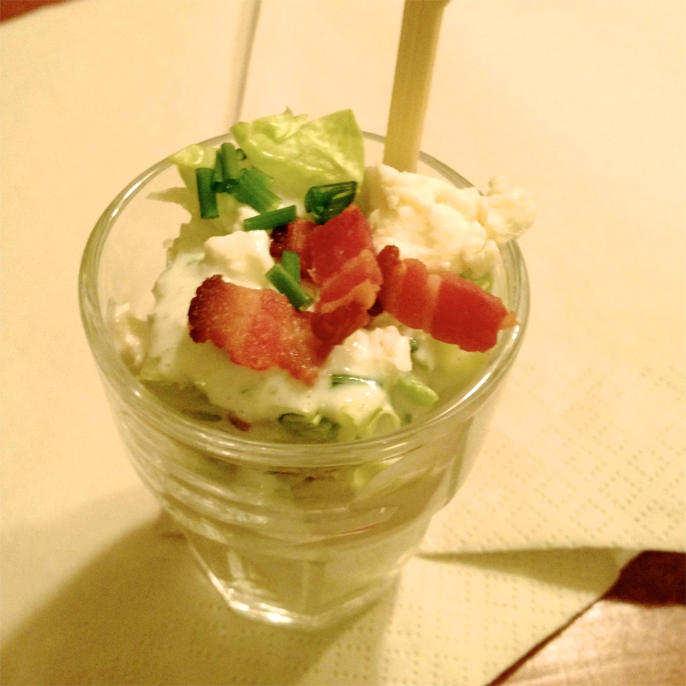 Pour a teaspoonful or two of dressing onto the lettuce in each dish. Top with some crumbled blue cheese, a few pieces of bacon, and a sprinkling of chives. At this point, they can be covered and chilled for up to an hour before serving.