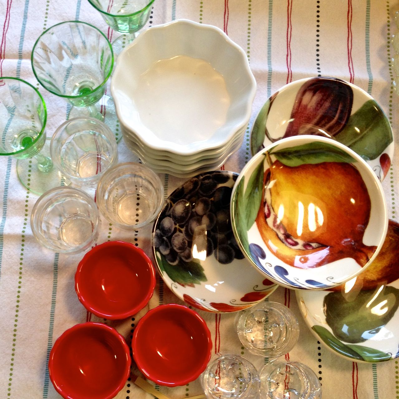Set out your serving dishes. These can all be the same, or use an assortment of like sized dishes & glasses. In the picture I have some liqueur glasses, brûlée dishes, sauce dishes, as well as some of my appetizer cups. Be creative. Clean 2-3” clamshells would work well, or clean glass votive holders. I like to serve the salad with little bamboo forks, but if you have something else that would work well, use it!