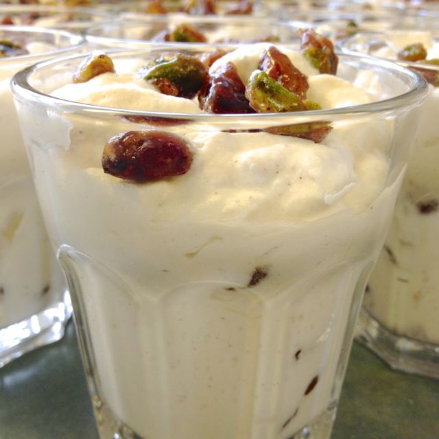Reserving enough pistachios to garnish with (I use about 7 per dessert), add the remainder to the cream & egg mixture.