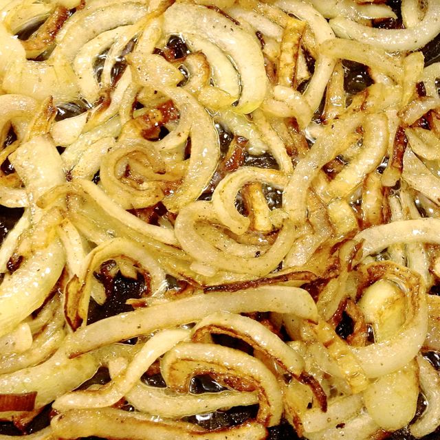 Cook the onions until they’re golden and starting to crisp along their edges, 8 minutes or so.