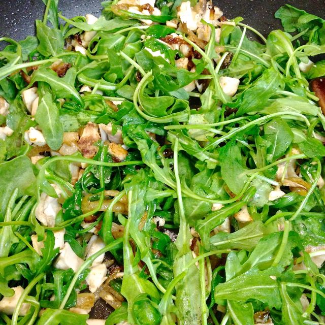 Add in the arugula and cook while stirring slowly, until the arugula has wilted.