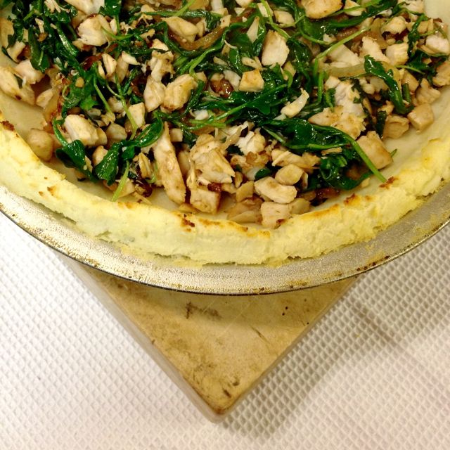 Put the cooked vegetables and chicken in the bottom of the baked crust.