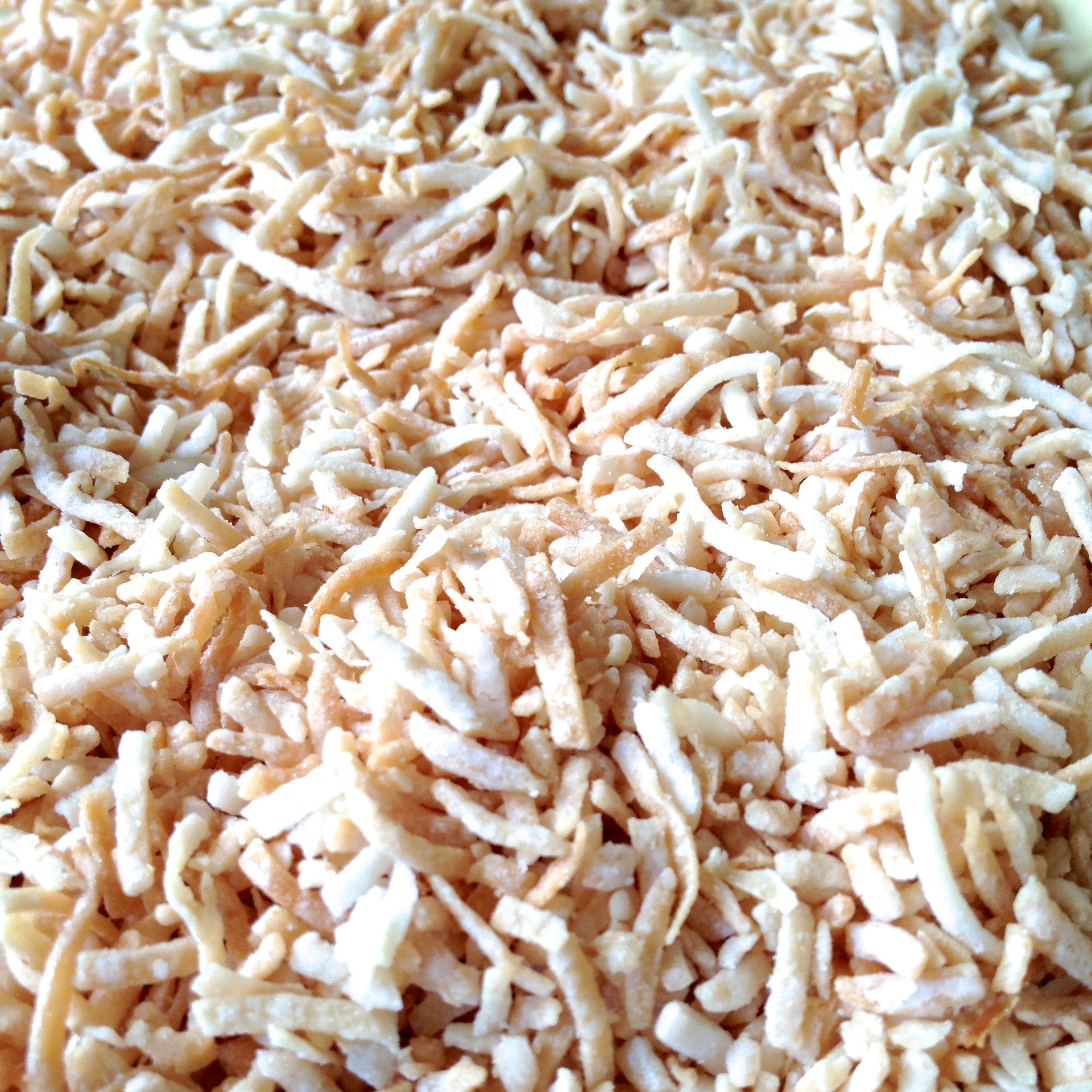 Toast the coconut for the cake, as well as the coconut for the final garnish.