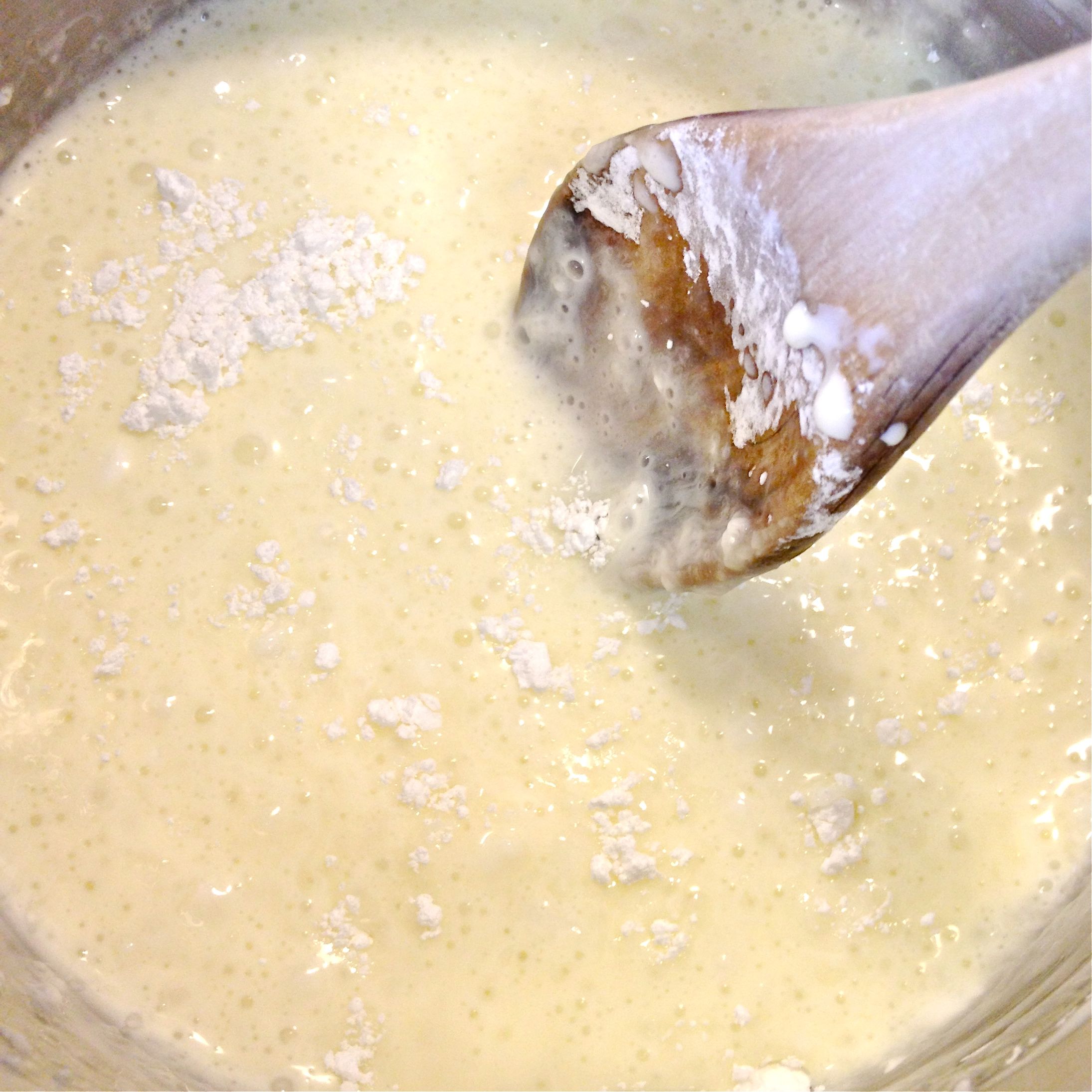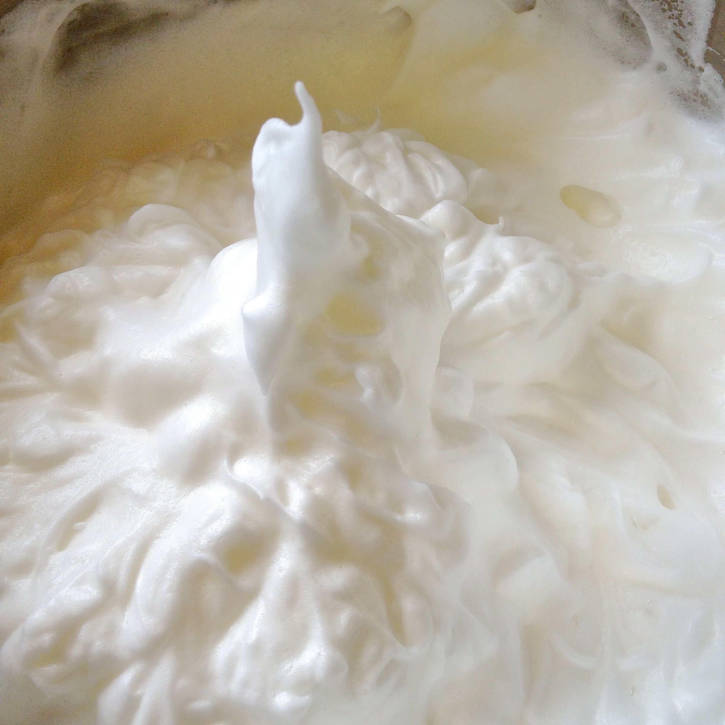 Add in the cooled mixture in a couple of additions, and beat constantly, until firm peaks hold.