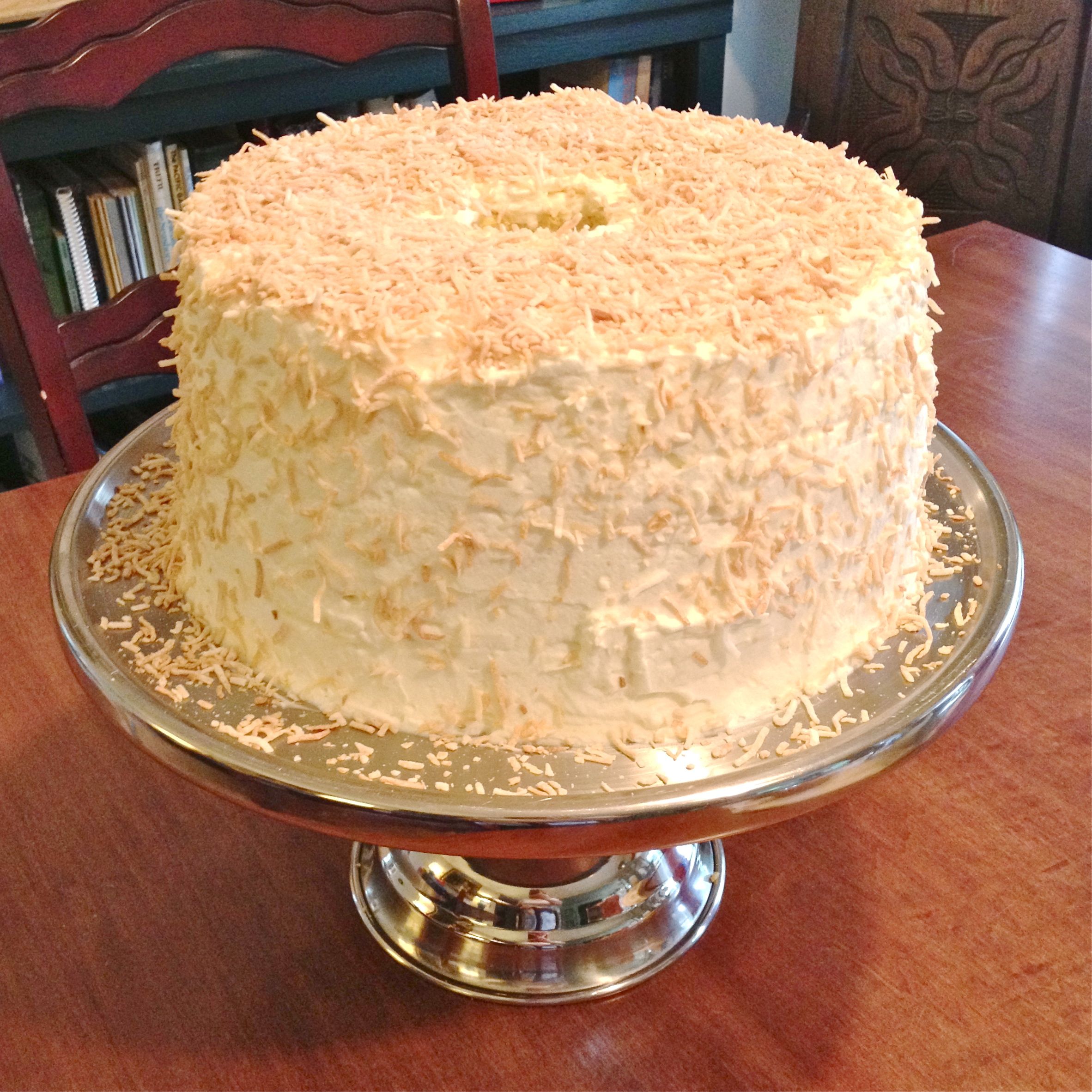 Holding the cake at a slight angle over a clean work surface, dust with the toasted sweetened coconut. Scoop up any coconut that falls, and add it to the cake.