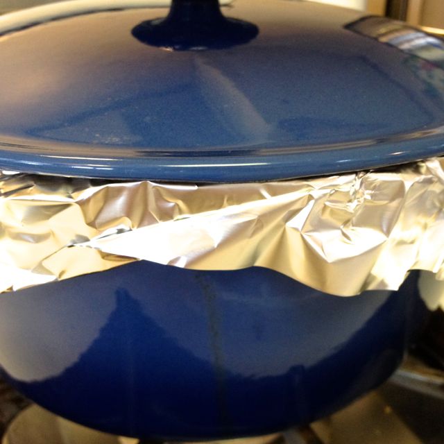 Cover the baking dish with foil, and then cover with the lid. This is to retain as much moisture as possible.