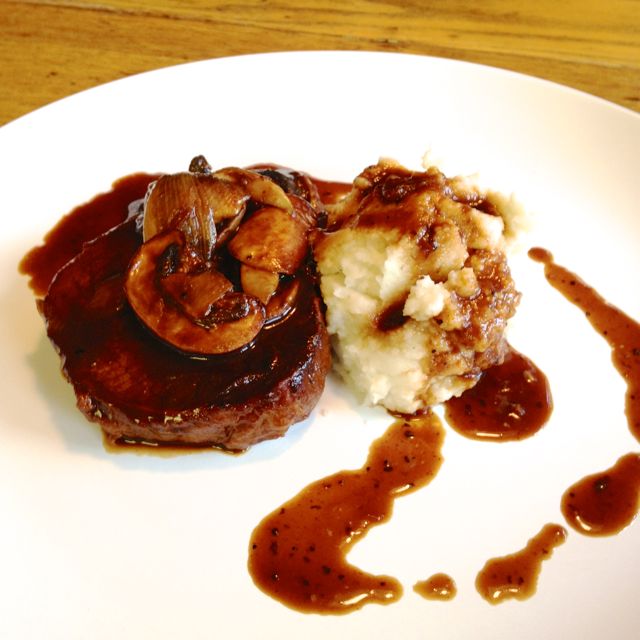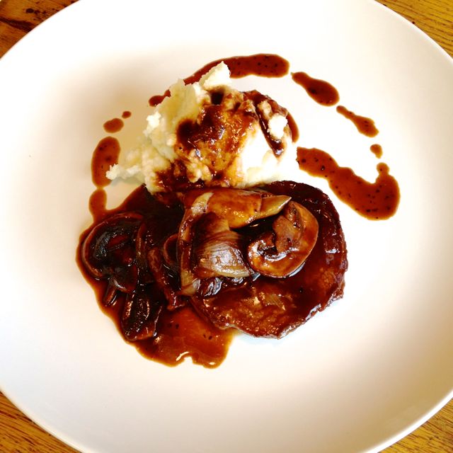 Spoon out some mushrooms and shallots, along with a bit of sauce, to cover the steak.