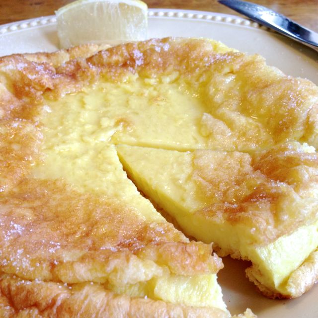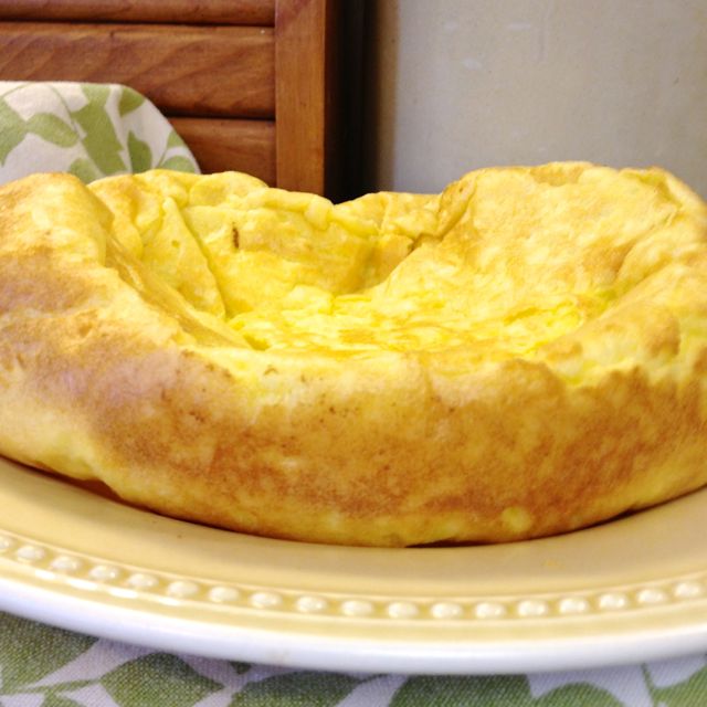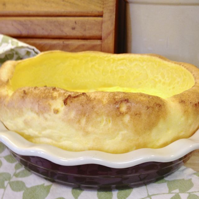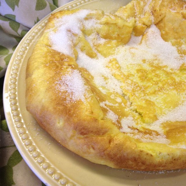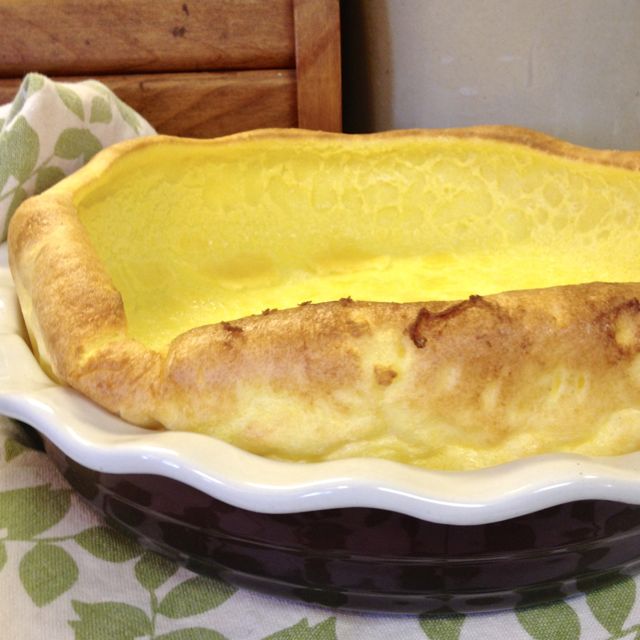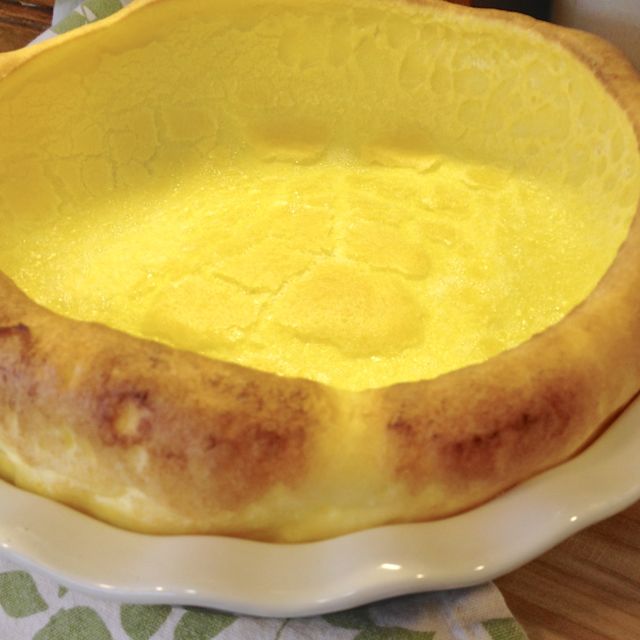 The Dutch Baby is basically a huge popover.  You can use a small cast iron pan, enameled bake ware, or a plain cake pan, anything from 8-9” in diameter.   All you need is equal volumes of eggs, milk and flour, with a bit of butter.  When it comes out of the oven, its sides will have risen up well over the edge of the pan.  Simply invert it onto a plate and serve with a sprinkle of sugar and a drizzle of lemon ~ fresh fruit, a dollop of preserves or a bit of syrup work well, too.  Plan on sharing one between two, or one each for hungrier folks.