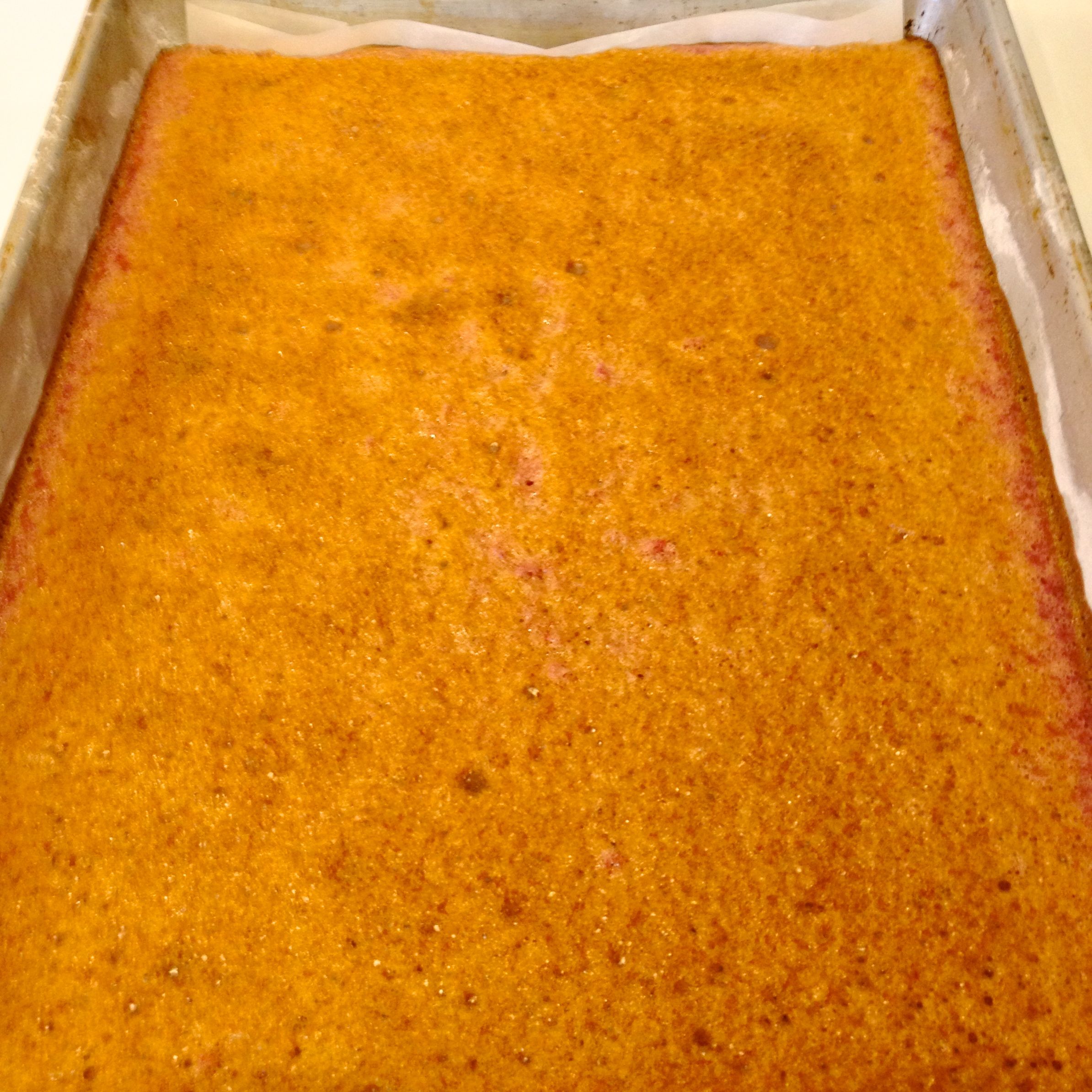 After baking for a couple of minutes, to show the butter throughout.  Also shows the parchment at the ends of the pan.