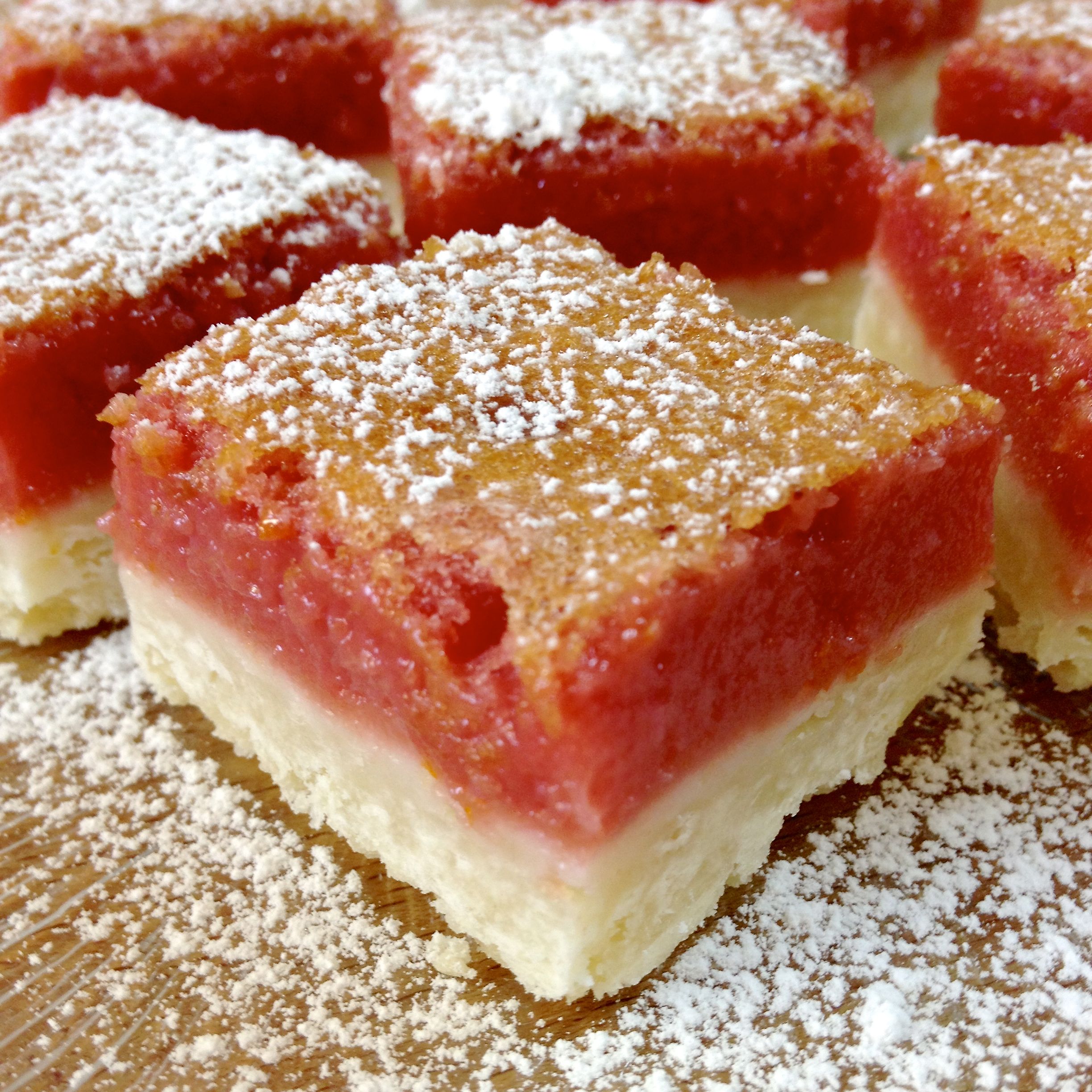 This year I thought I’d be smart and buy 10 pounds of them.  That’s a whole lot of cranberries.  Now as winter dies down (I’m being optimistic), I’ve been making curd with them. As I was figuring that out, I thought about trying them as a topping for a cookie bar, like lemon bars.  After a few tries, I’ve got this one figured out.  They need a little more cooking, and a little more stabilizing from flour than lemon bars.  The red filling is a nice change, and the tartness of the berries with the orange citrus is very yummy.