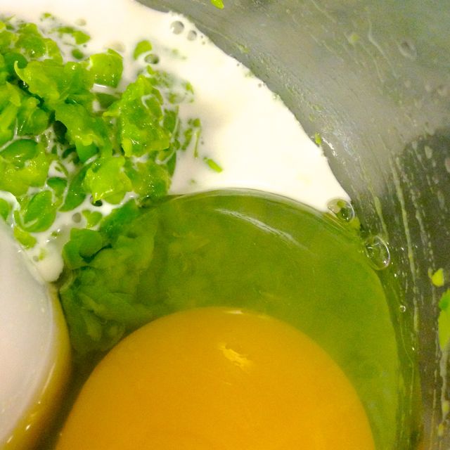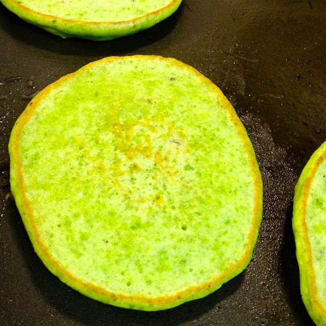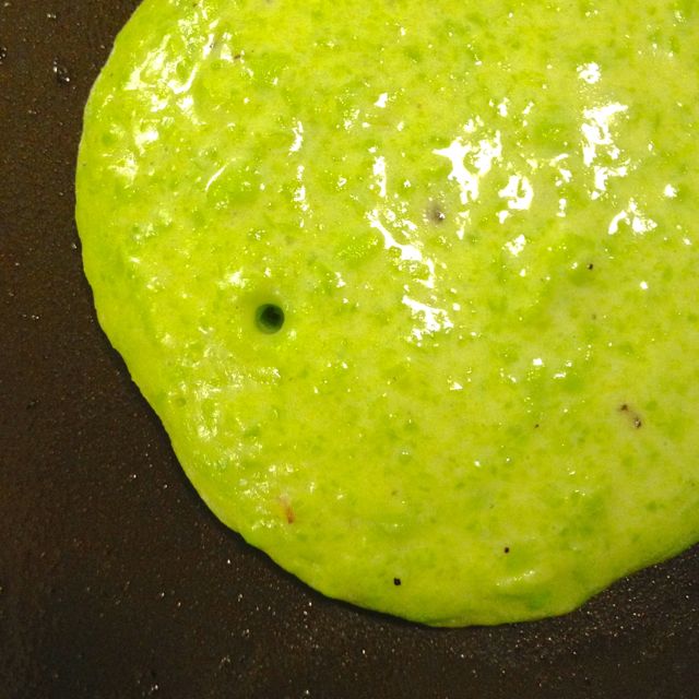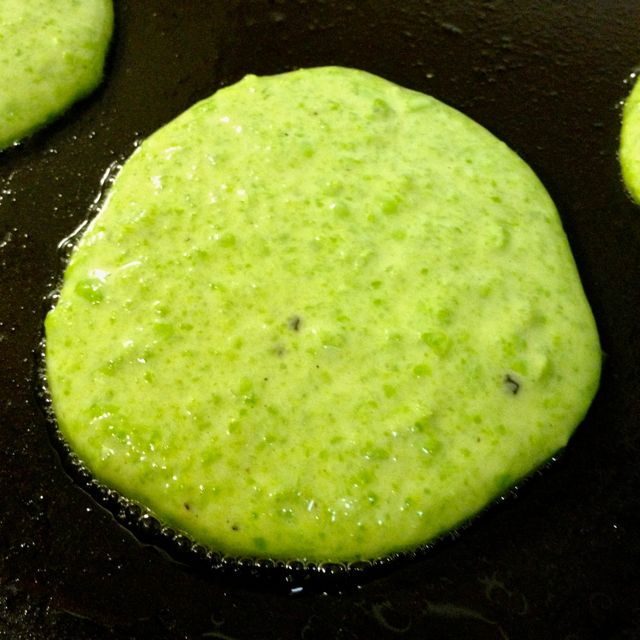 Add in soupspoonfuls of pea mixture to the hot pan, leaving a bit of room for the batter to spread.