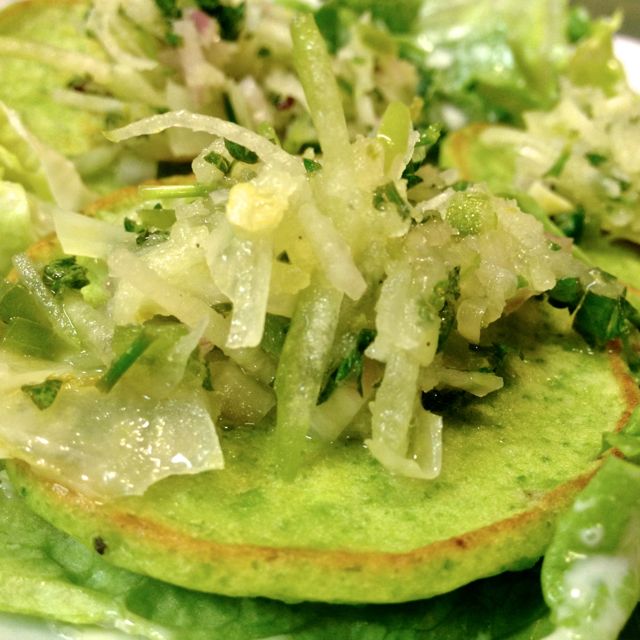 Just in time for St. Patrick’s, this is a very green dish, with a light, tart salsa in small mounds on top of bright green little pancakes. I’m sure they should be called something like “Emerald Isles”. Bonus: they work really well Gluten Free.