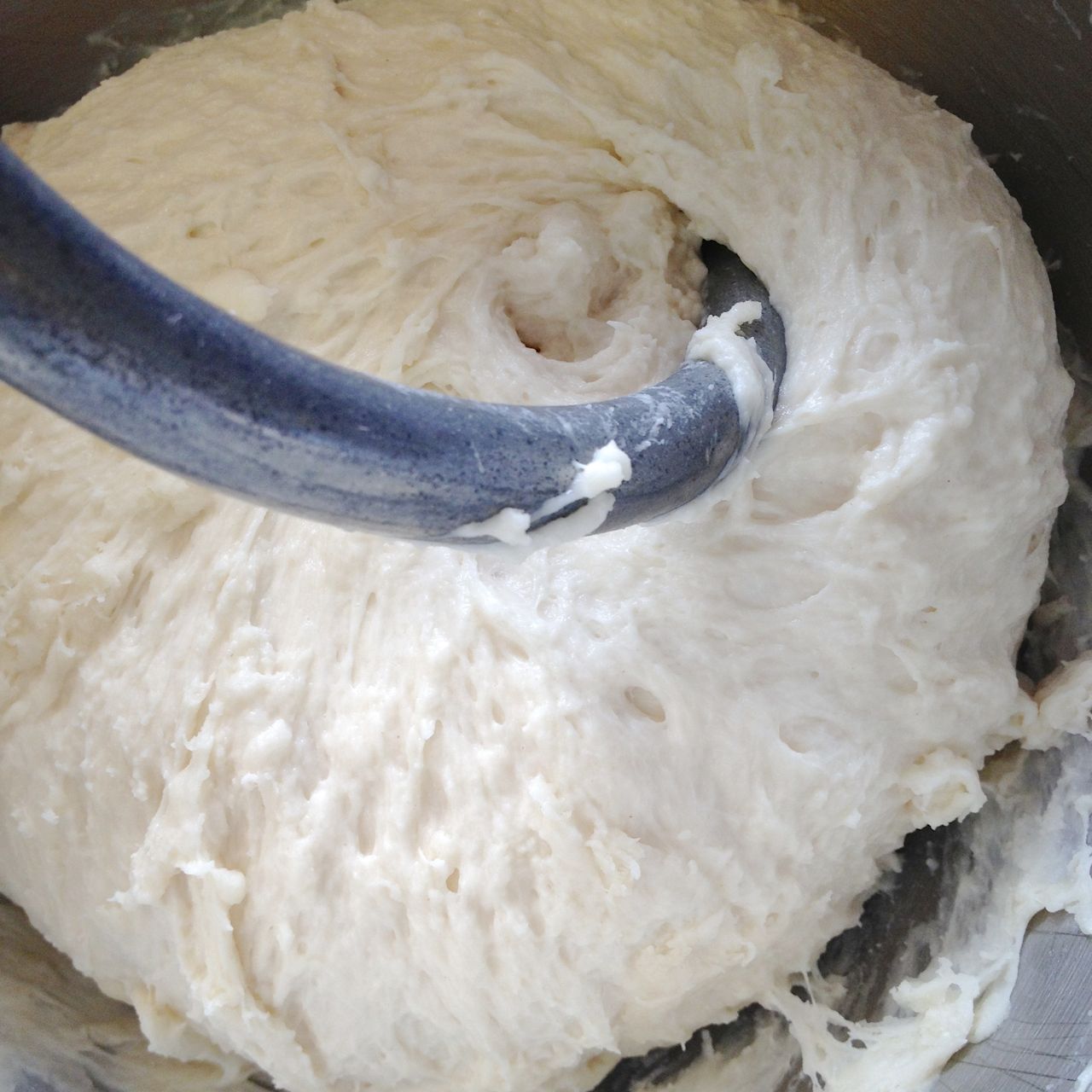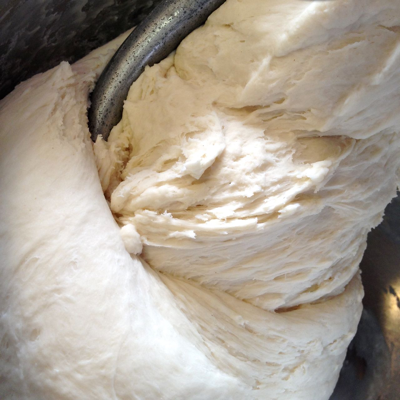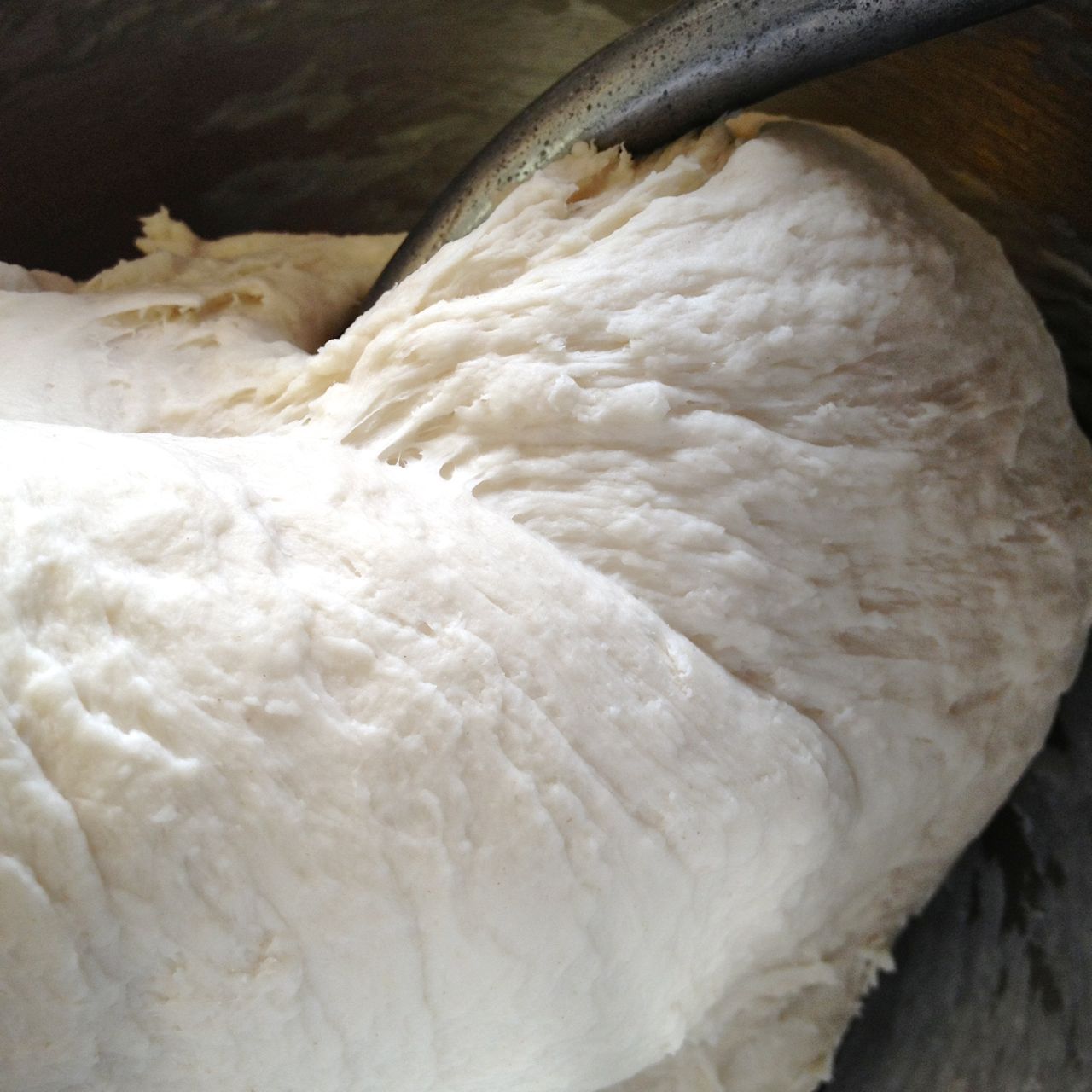 Continue kneading until the dough is slightly glossy, and has pulled away from the bowl, and become smooth, 5 minutes or so.IMG_6902