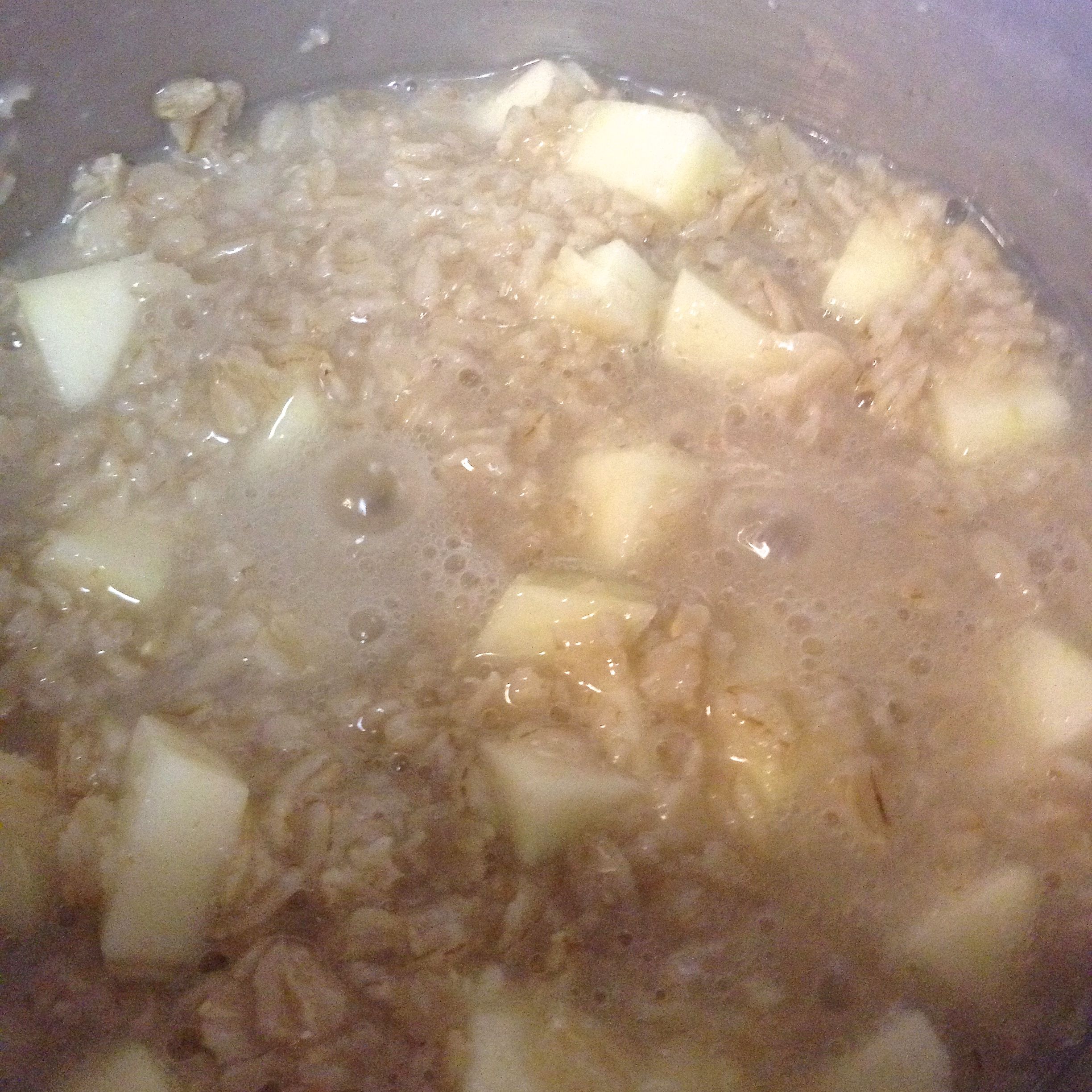 At 5 minutes remaining, add in the spice and apple if using. If you’re using berries, wait until the 10 minutes is up before adding.