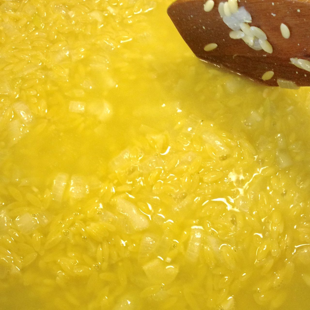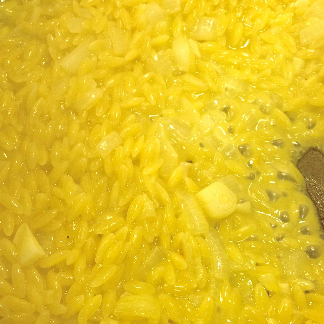 Add in the orzo, and stir, cooking, until it is all glistening from the oil, about 2 minutes.