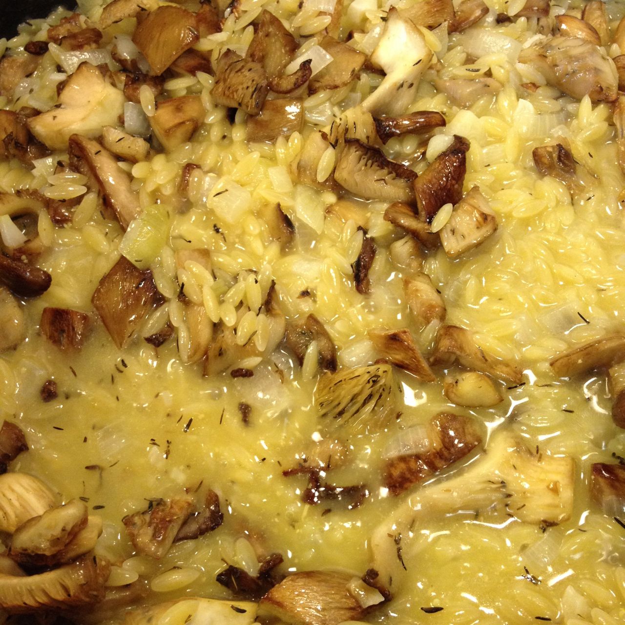 Add in the mushrooms and thyme leaves and cook over medium heat, stirring occasionally while working on the orzo mixture.