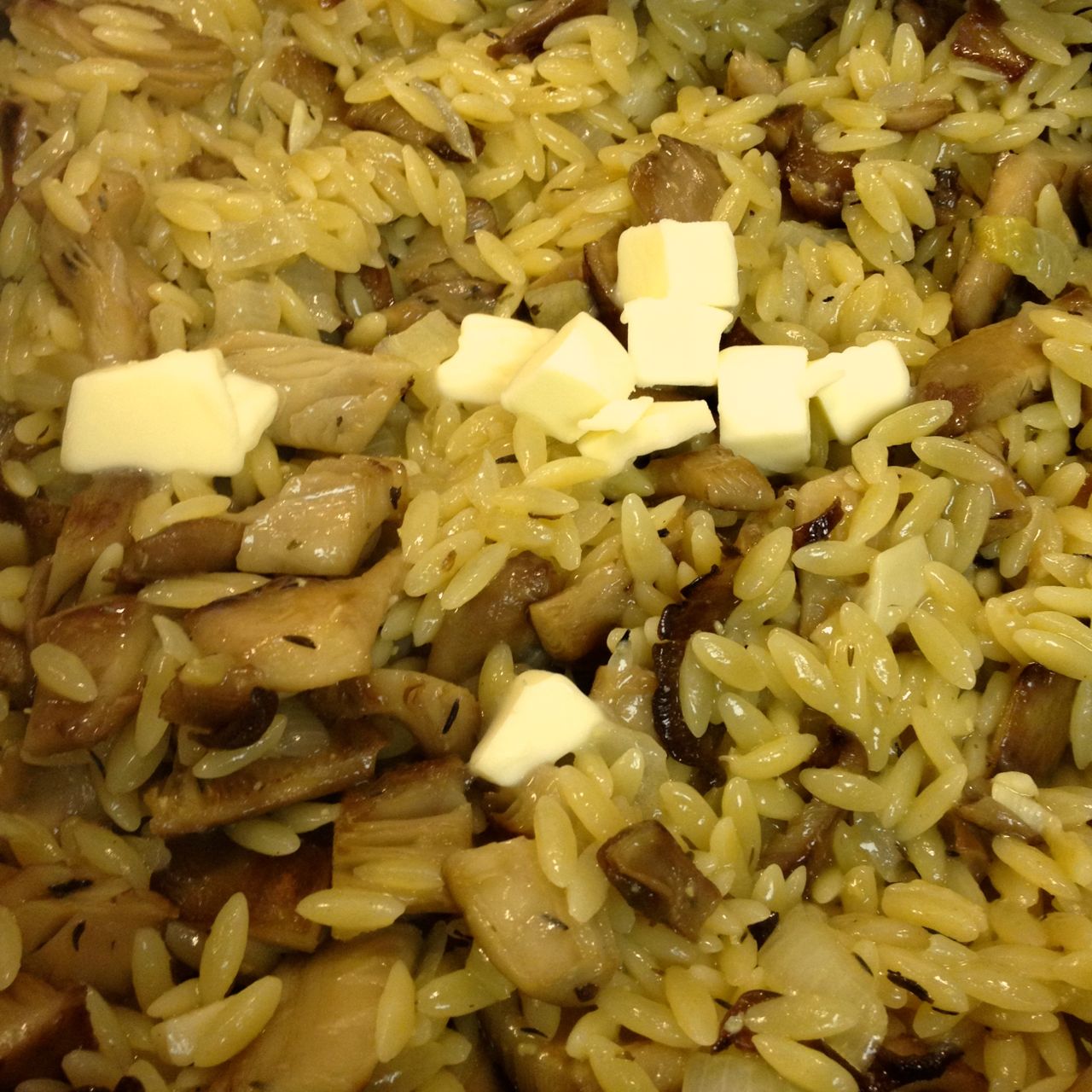 There were about 8 feet of them, all over the top half of the log. I found them when they were perfect, the bugs and slugs hadn’t got to them, and they hadn’t started to dry out at the edges. A totally unexpected bounty! For dinner I made up a super easy orzo based risotto type dish. As we’d recently returned from travels, my pantry was quite depleted, but I had all I’d need to make an incredibly mushroomy dish.