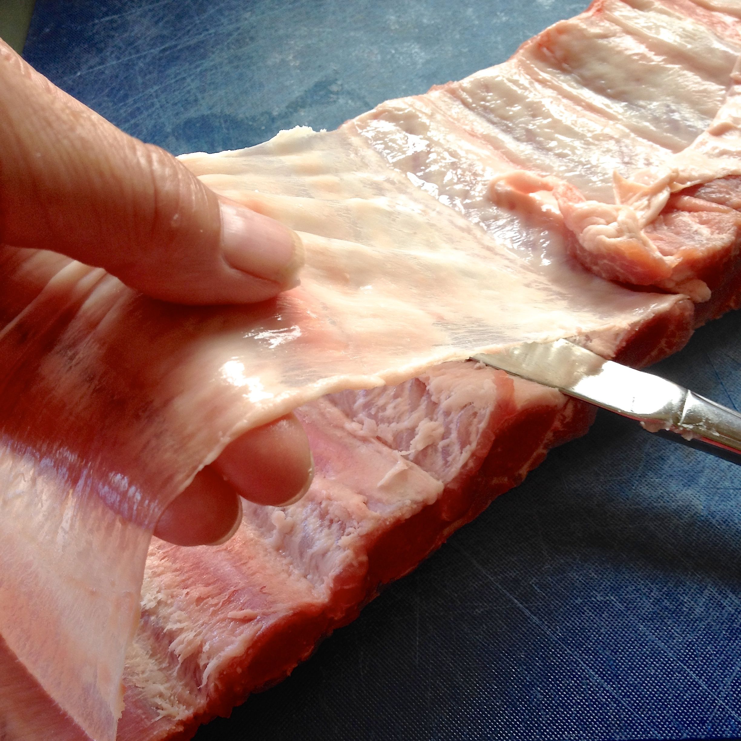 Remove the silver skin off the back of the ribs, using a table knife to separate it while pulling with your hand.