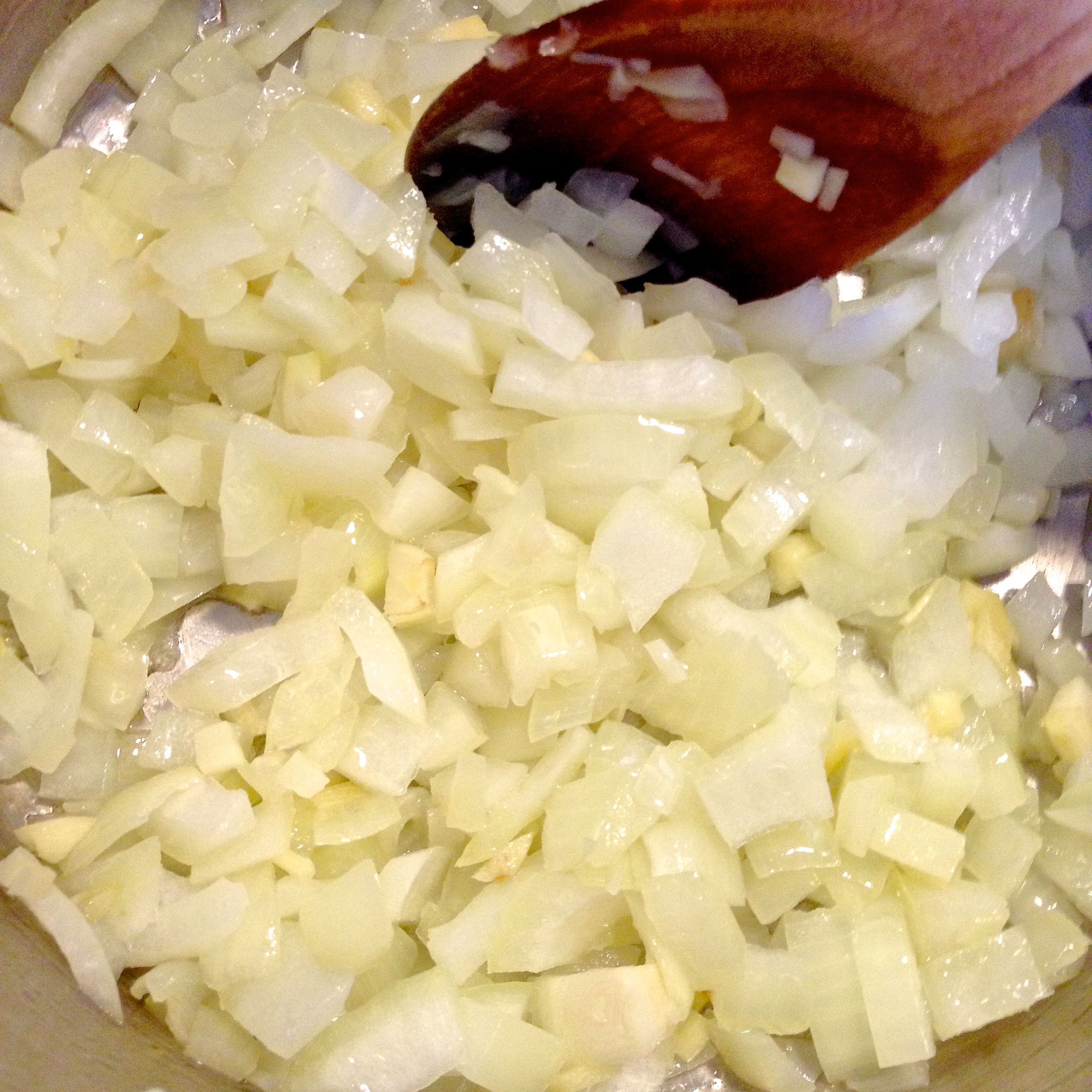 Add in the onion and garlic, cook gently until it is absolutely clear and looks melted, about 8 minutes.