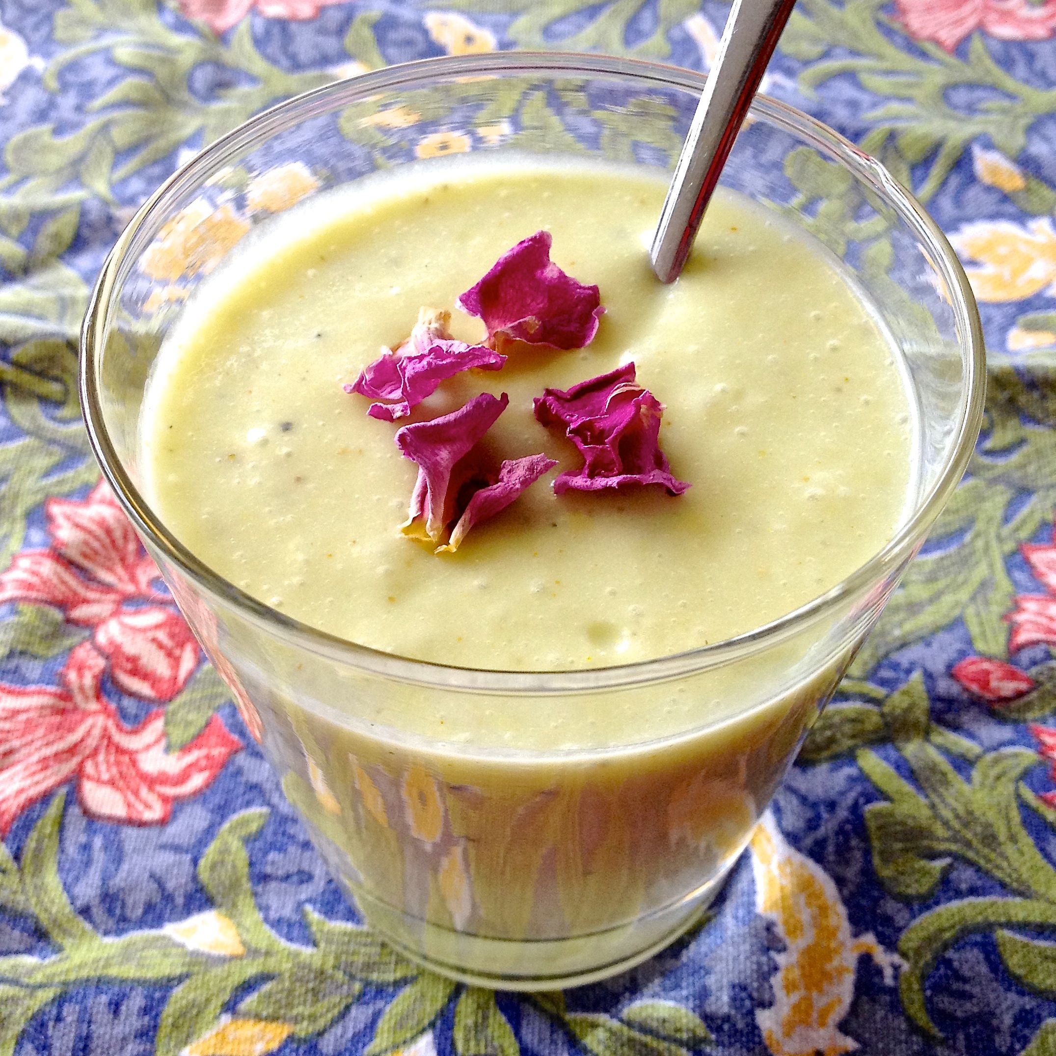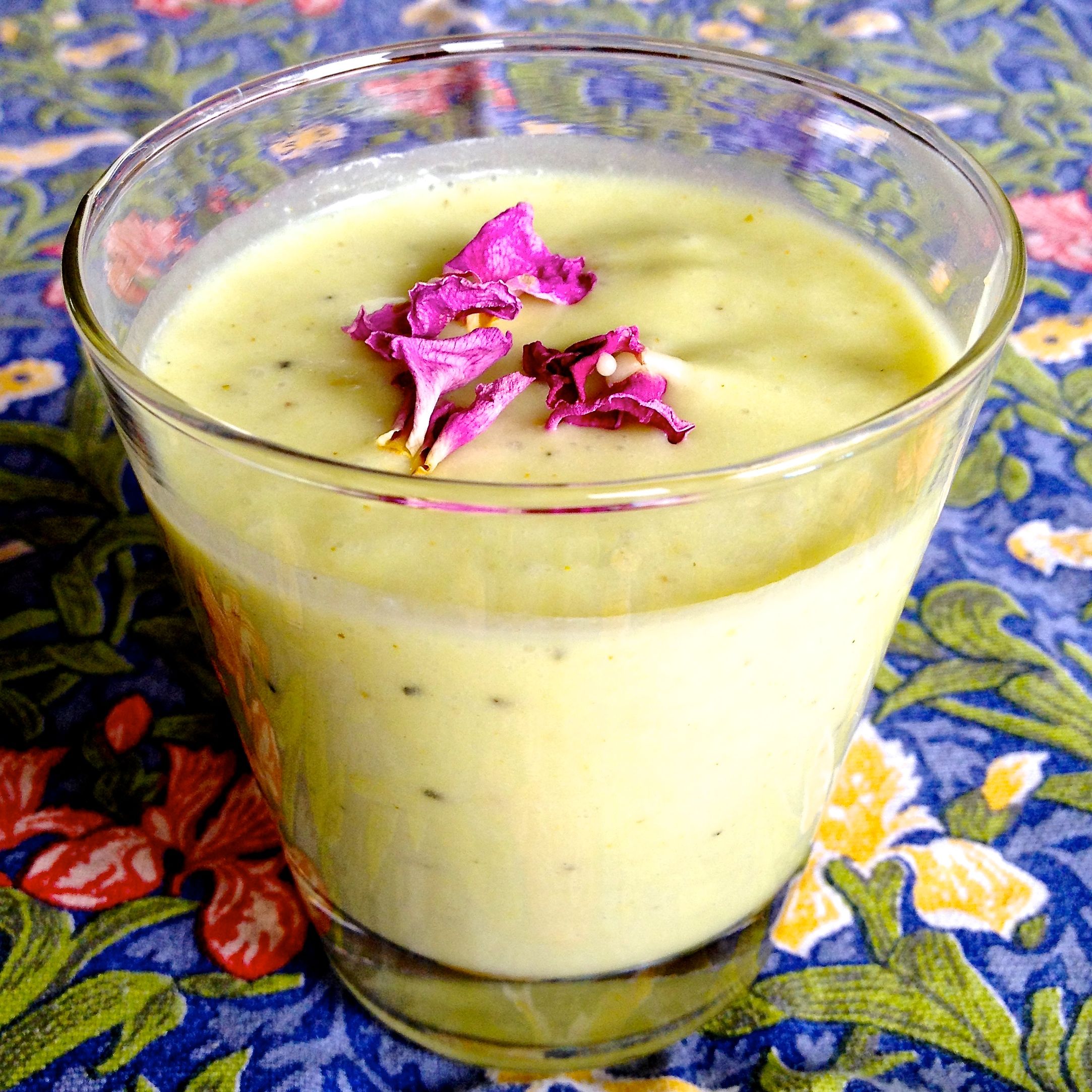 Serve in chilled martini glasses, or other cute glasses, with a simple flower garnish. Shown here with dried rose petals.