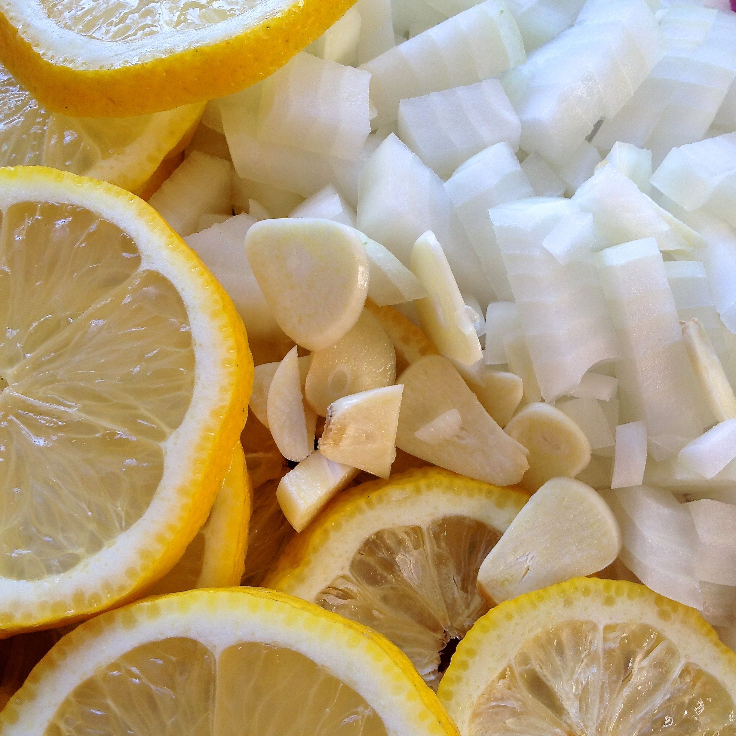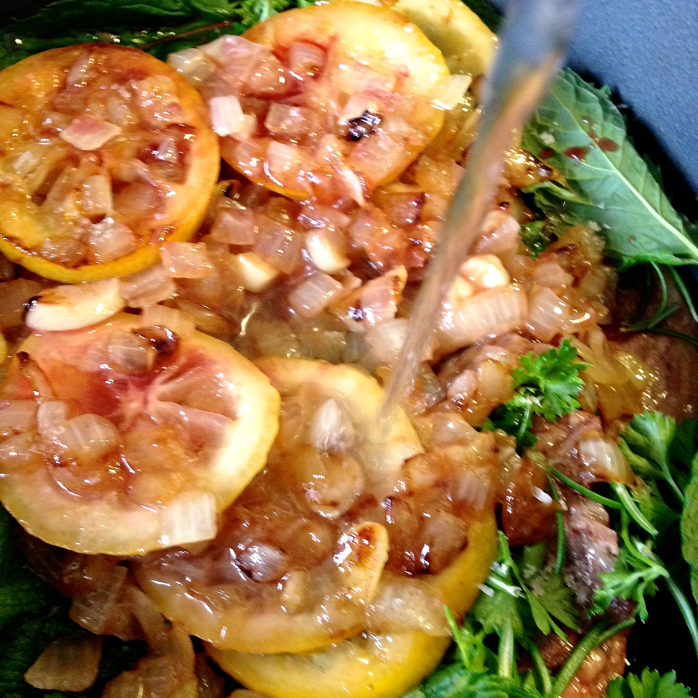 Put half the cooked lemon-onion mixture into the bottom of a Dutch oven or other heavy braising pot.