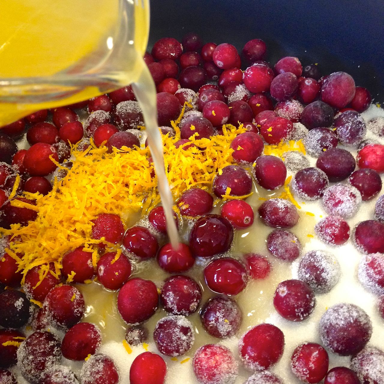 Pour the liquid over the cranberries, sugar, and zest. Stir to combine.
