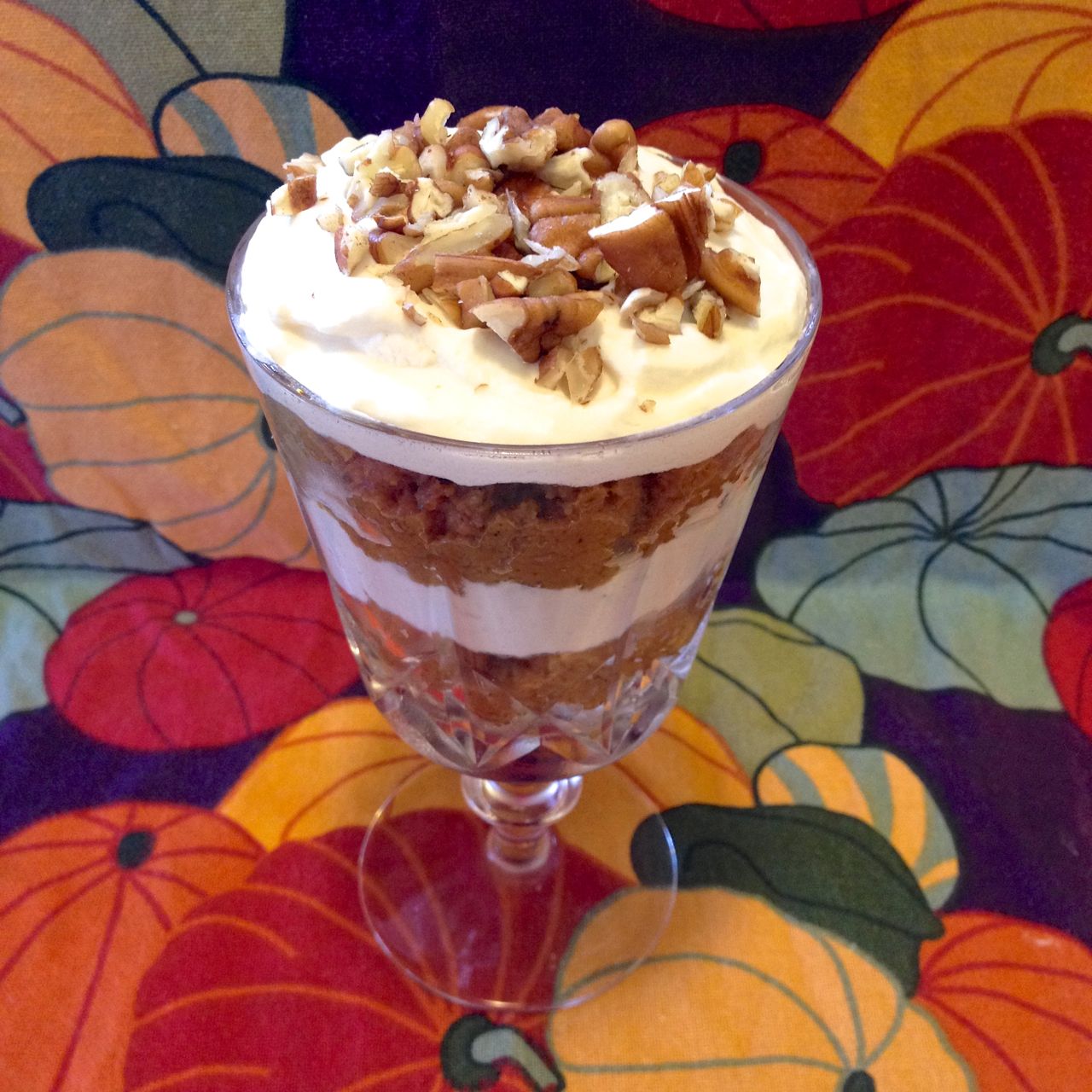 Put half of the pecans in the bottom of a pretty glass. Scoop up some of the pumpkin, and spoon enough into the glass that it fills it a quarter of the way. Follow this with an equal amount of whipped cream and another of pumpkin, smoothing the tops of each layer before adding the next. Cap off the second layer of pumpkin with a final cap of whipping cream. It should be slightly mounded.