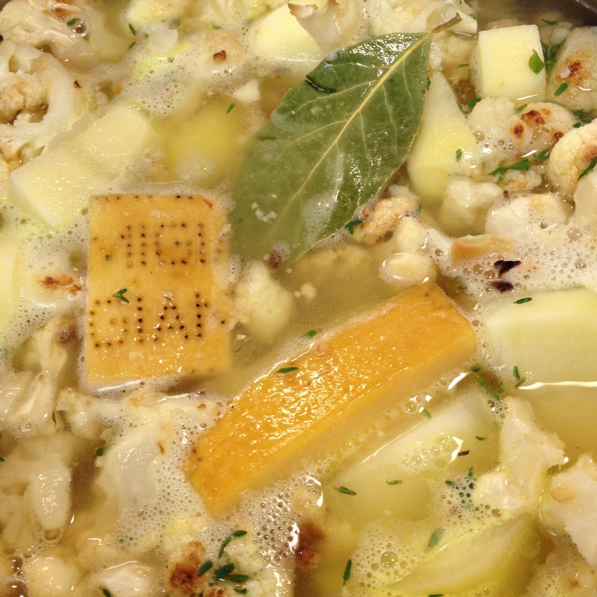 Add in the potatoes, the stock, thyme leaves, bay leaf, and Parmesan rind.