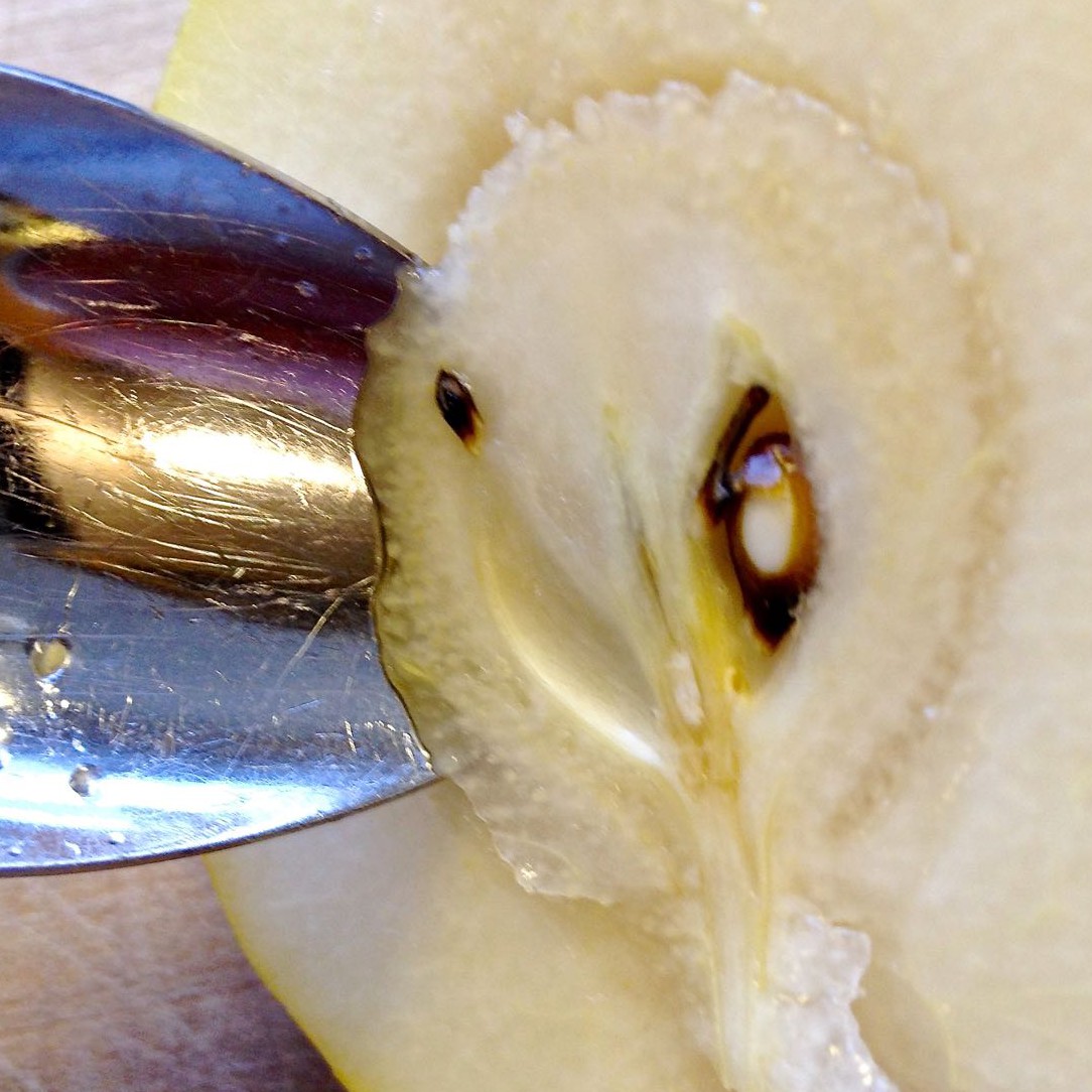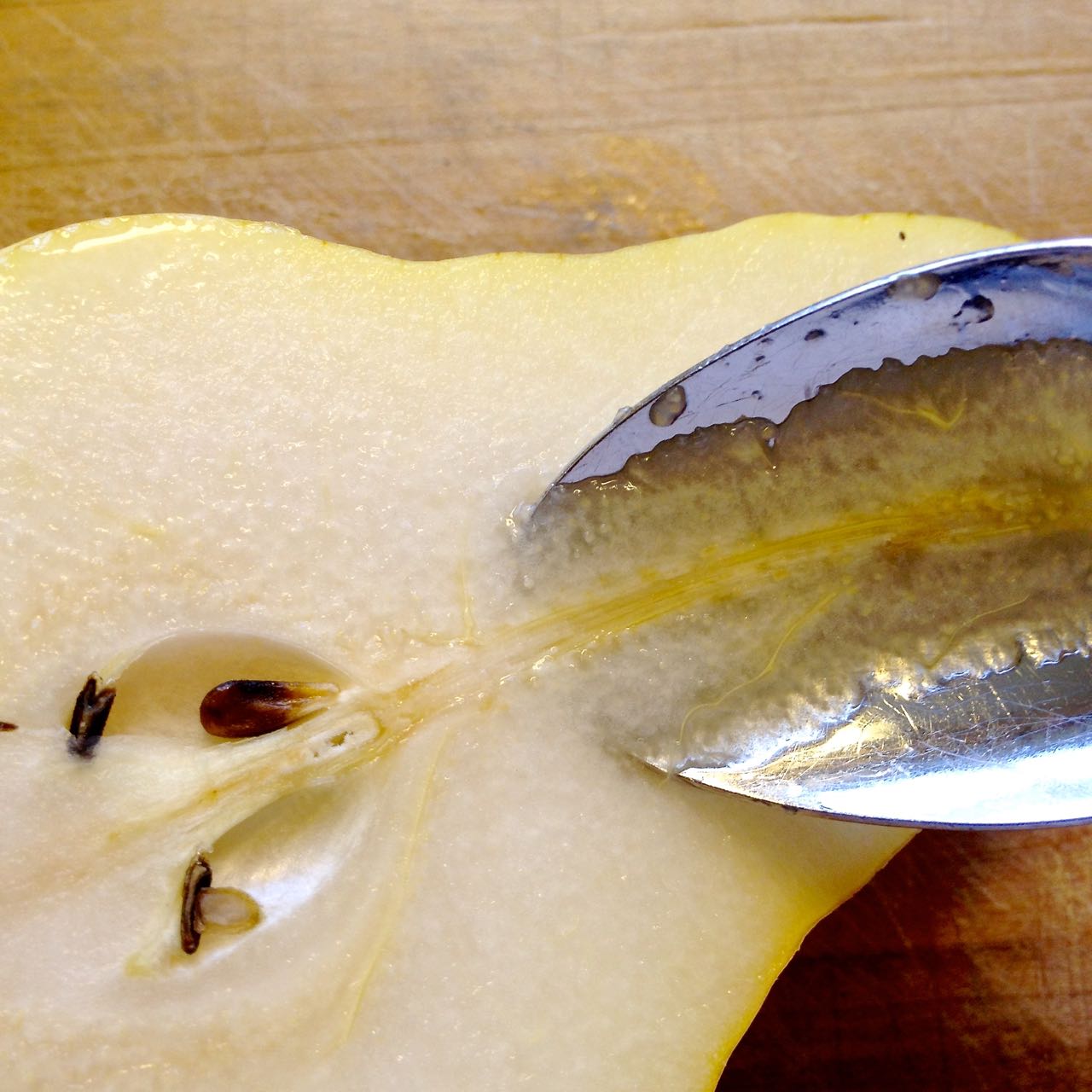 On the other half of the pear, push the teaspoon gently along under the threads towards the core, freeing the threads.