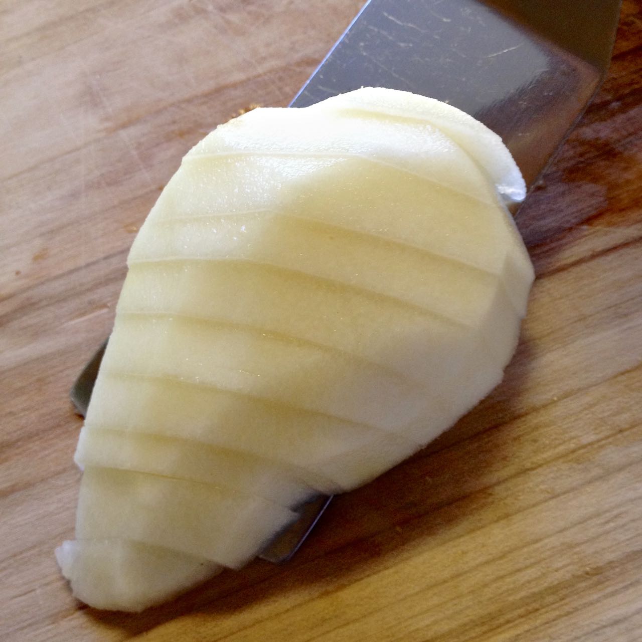 Crosscut each pear, slightly on the diagonal into ¼” slices, leaving the pear shape intact.