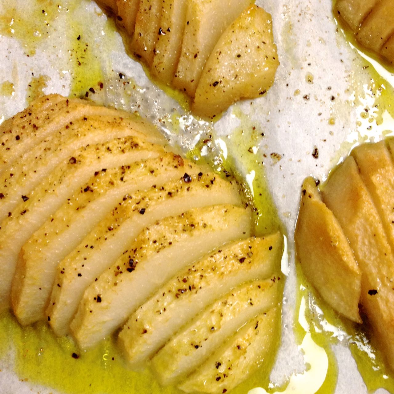 Using a spatula, lift the pears to a parchment lined baking dish or sheet.