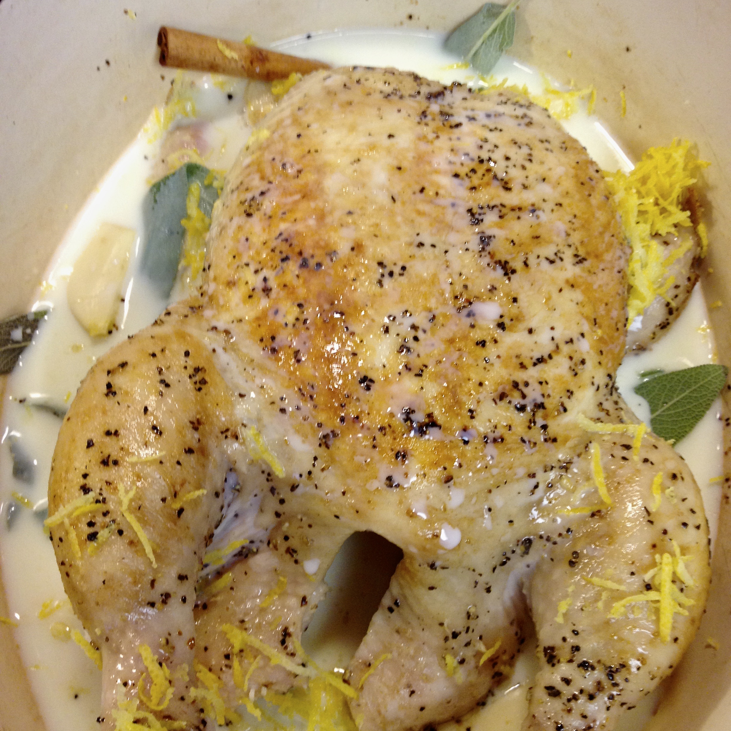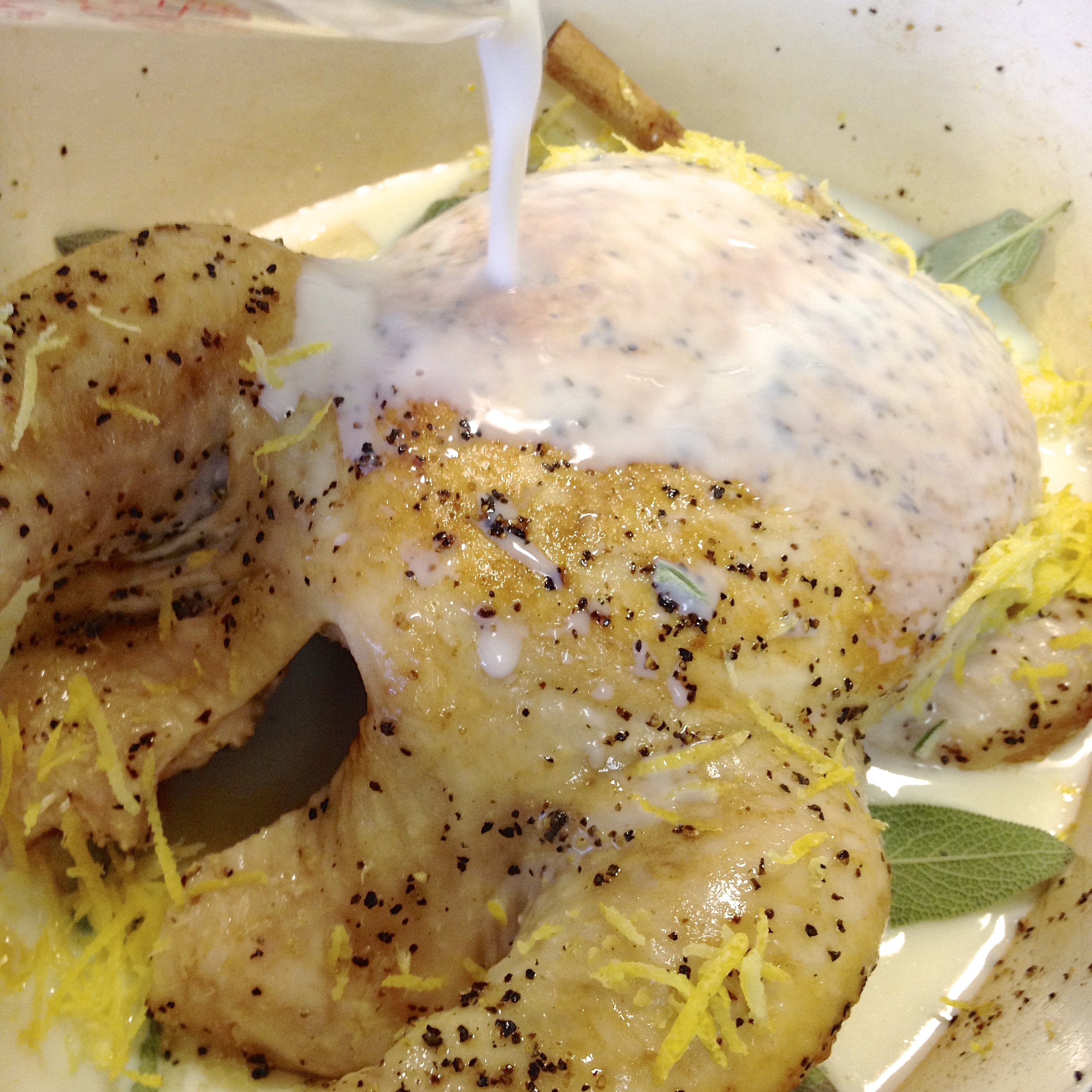 To serve, remove the chicken from the bones (excepting the wings & legs which are served meat on the bone), and arrange on a platter to serve. Pour some of the milk sauce over top, or serve on the side.