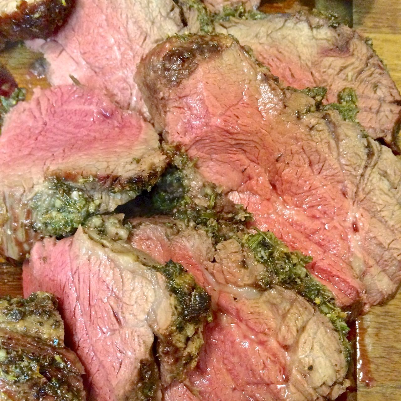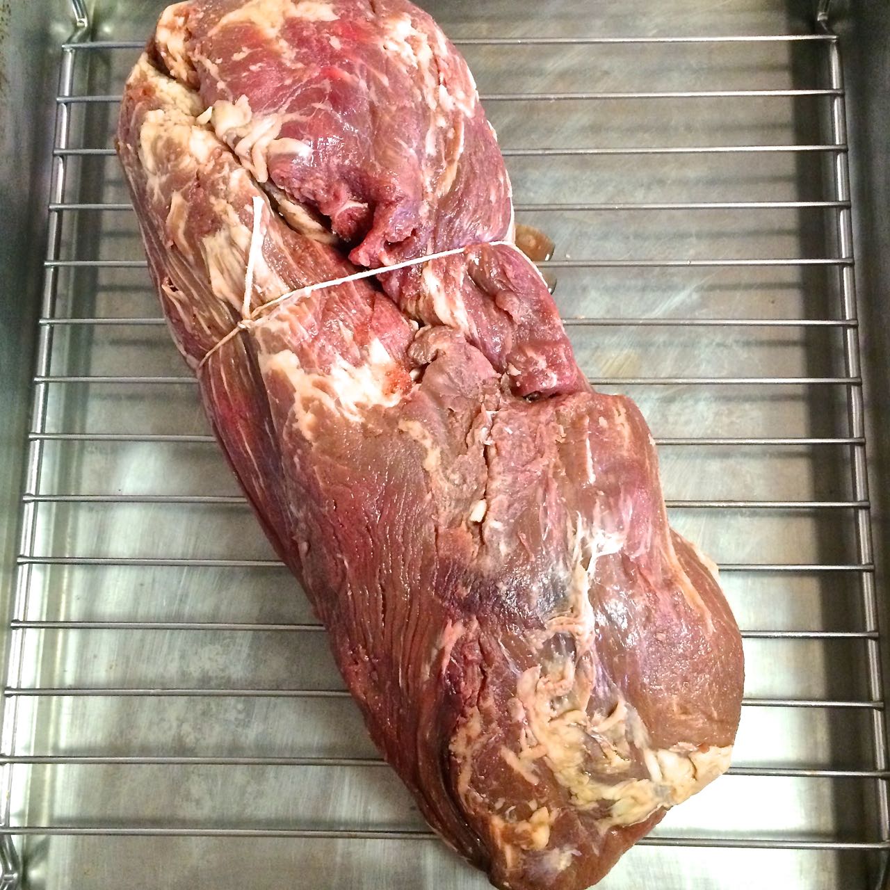 Take the roast out of the fridge to rest 1 hour before it needs to be in the oven, let it sit unwrapped and on a rack in a roasting pan. Tie back the long skinny end back on to the roast itself, creating a uniformly shaped roast.