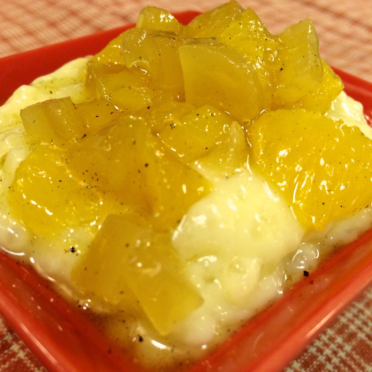 Here’s a simple little compote to dollop on rice pudding, tapioca, custard, or Panna Cotta.