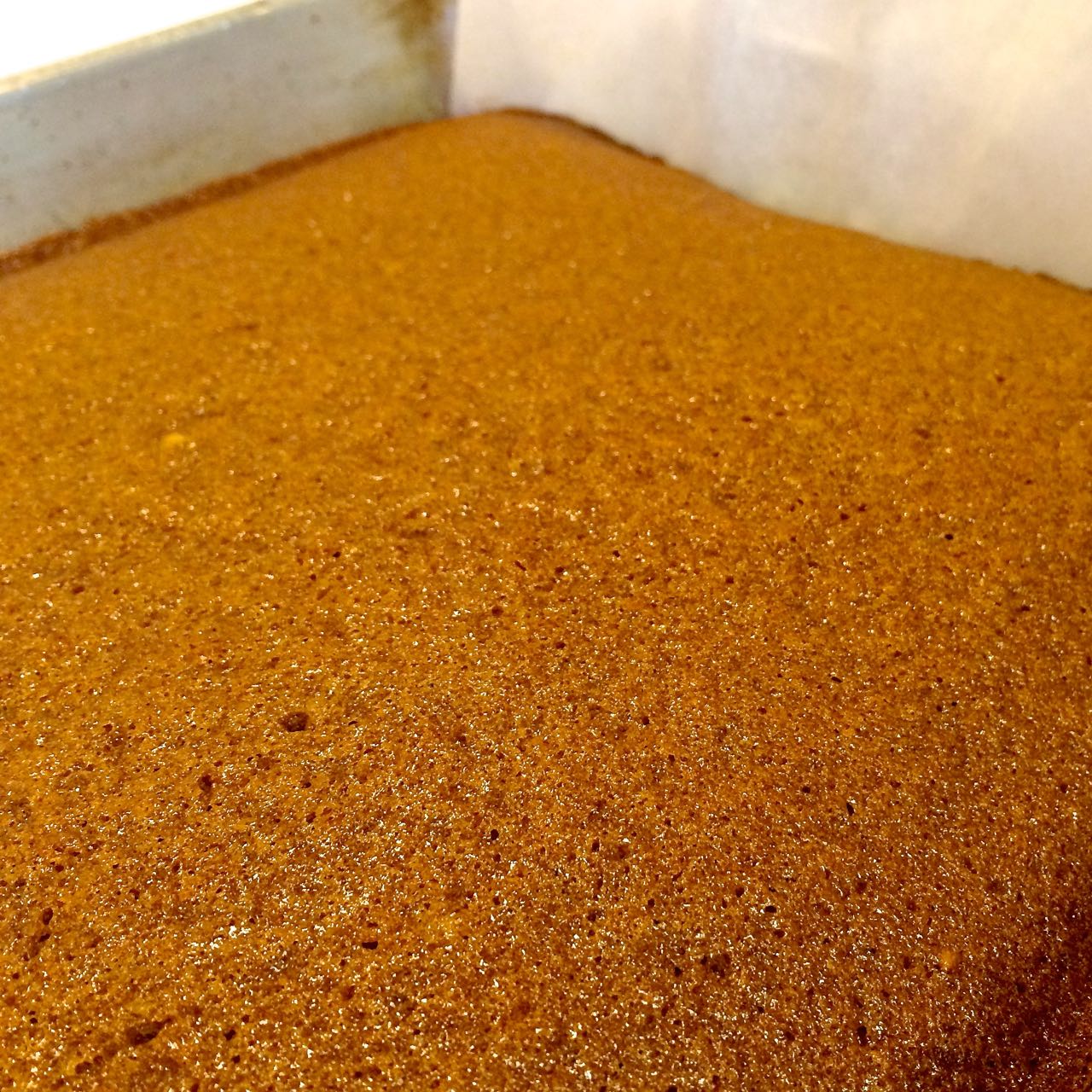 Line the base and two ends of a 9” x 13”pan with a length of parchment, leaving the ends a bit long for lifting the squares out of the pan after they’re cooled and iced, ready for cutting. Lightly grease the two long sides.