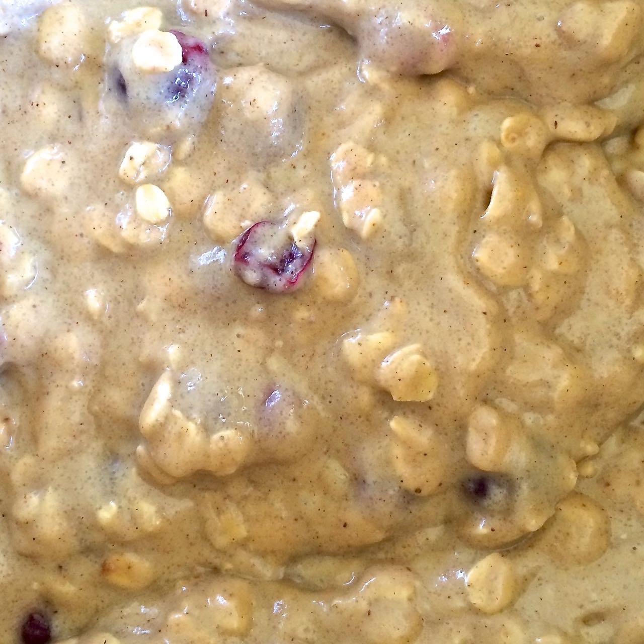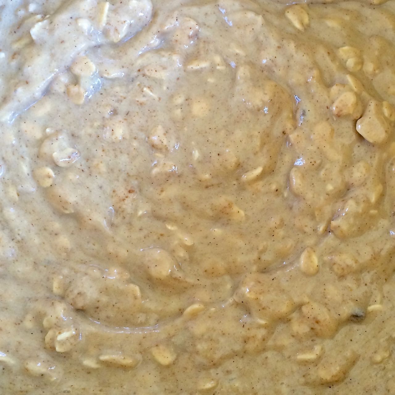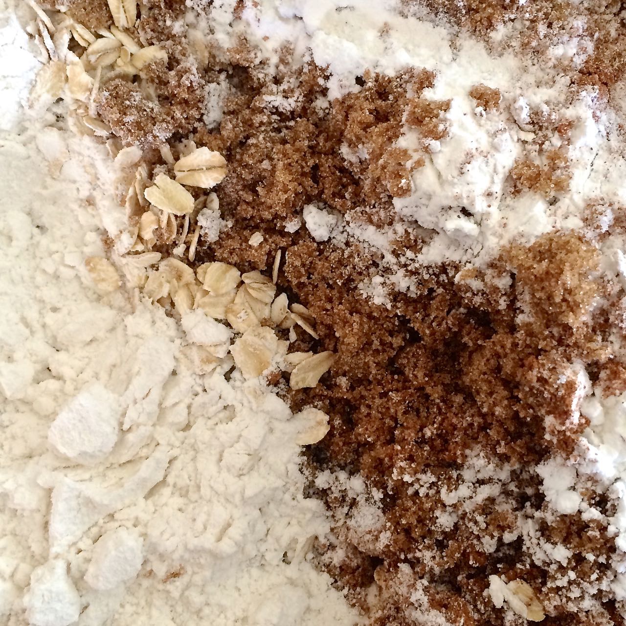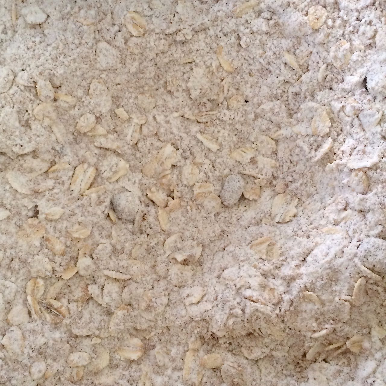 In a medium sized bowl, whisk together the flour, whole wheat flour, oats, brown sugar, salt, baking powder, and cinnamon.