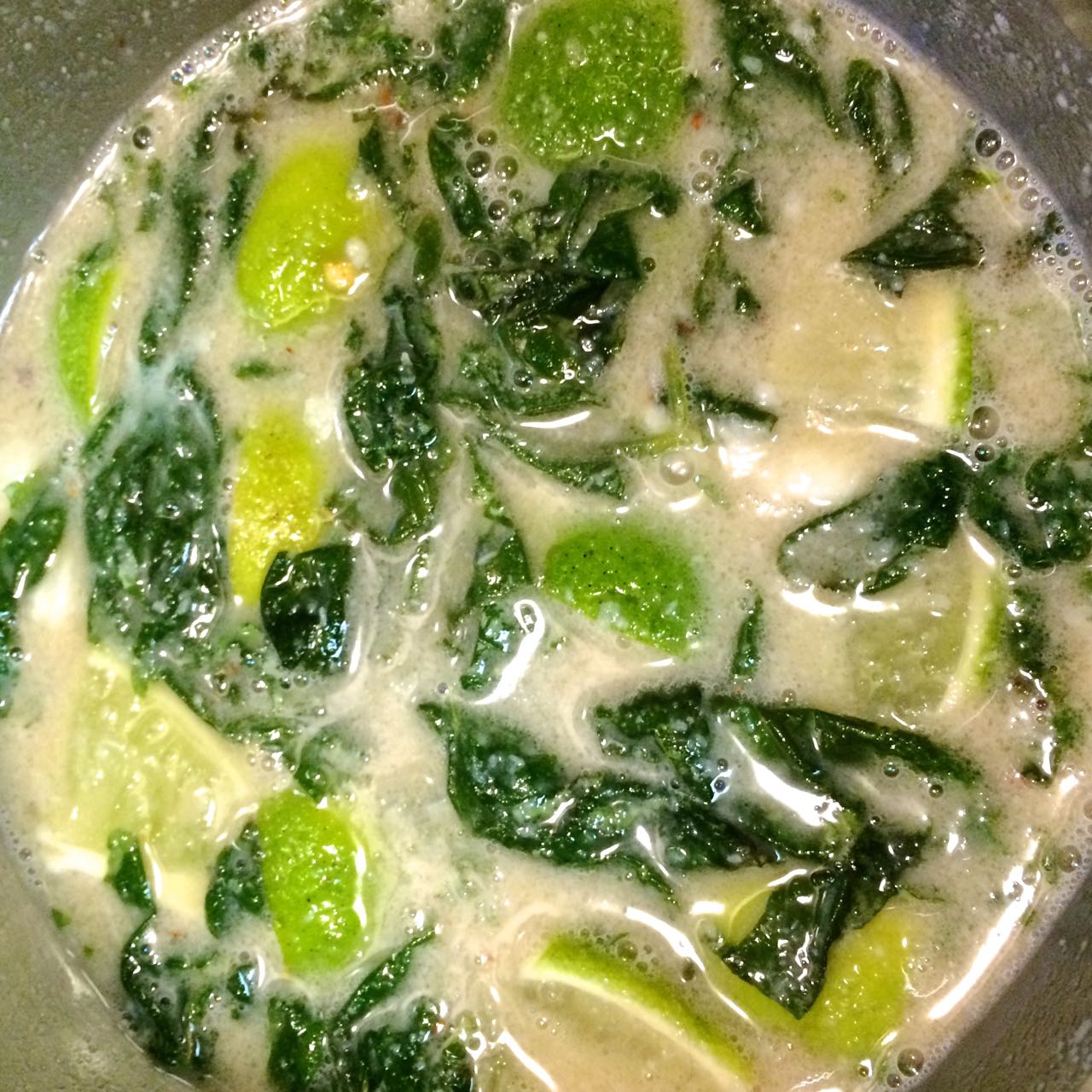 In a medium bowl, mix the lime pieces, basil leaves, coconut milk, water (or stock if using), brown sugar, fish sauce, and chilies. Stir well, dissolving the sugar.