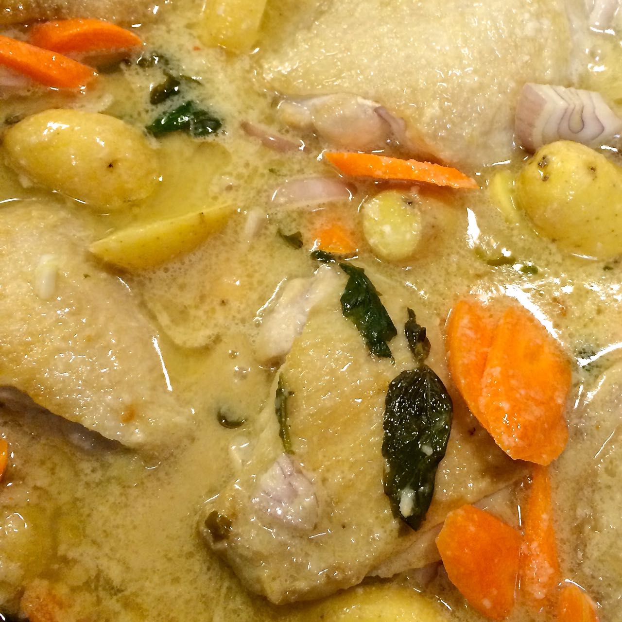 Vegetarian Option: Omit the chicken. Lightly fry the shallots in the oil, just until they are starting to become golden. Slowly add in the liquid mixture, and stir carefully. Replace the chicken with about 1½ # of sweet potatoes, peeled & cubed, and a cored & chopped red pepper. Add both of these into the sauce with the potatoes and carrots. Continue with the recipe.