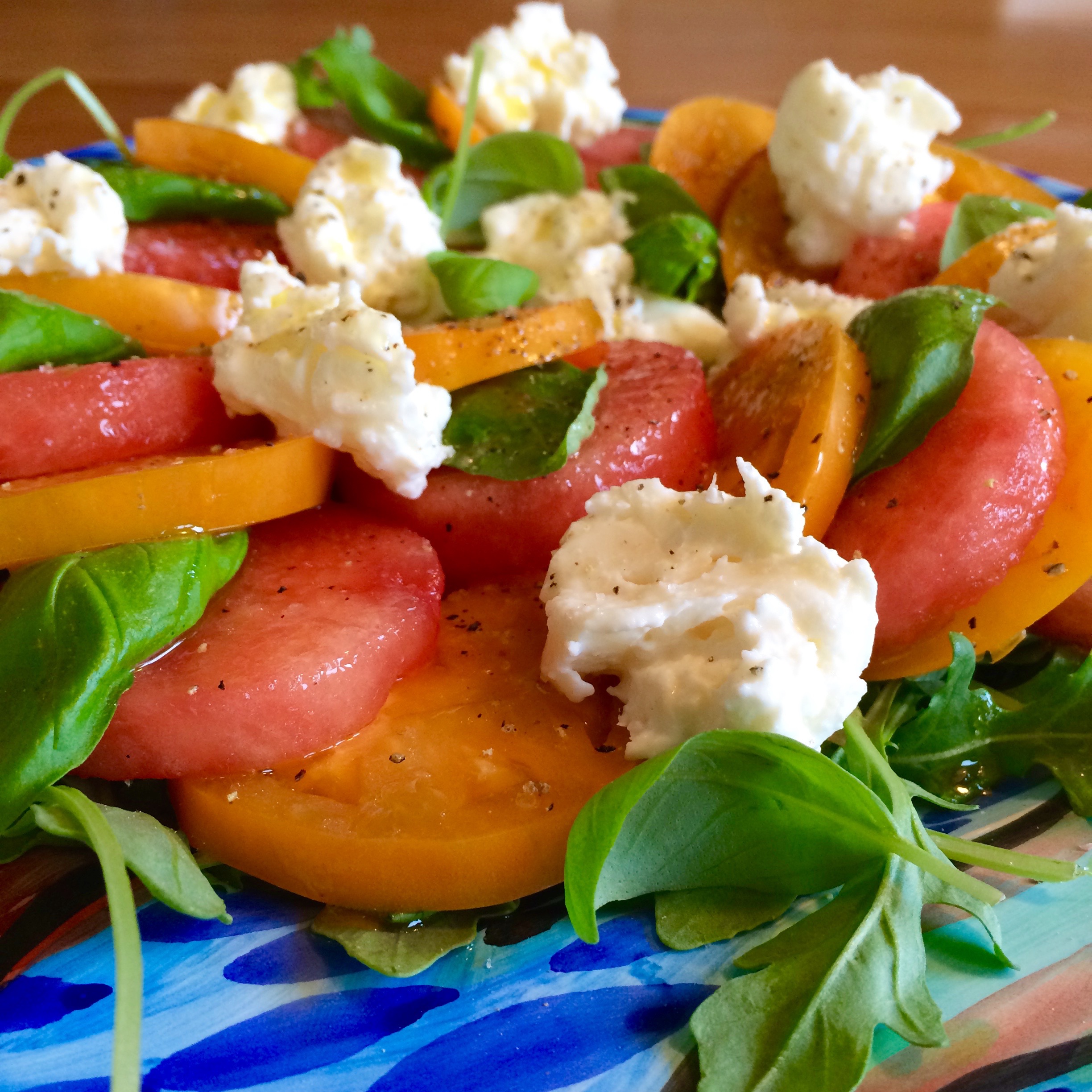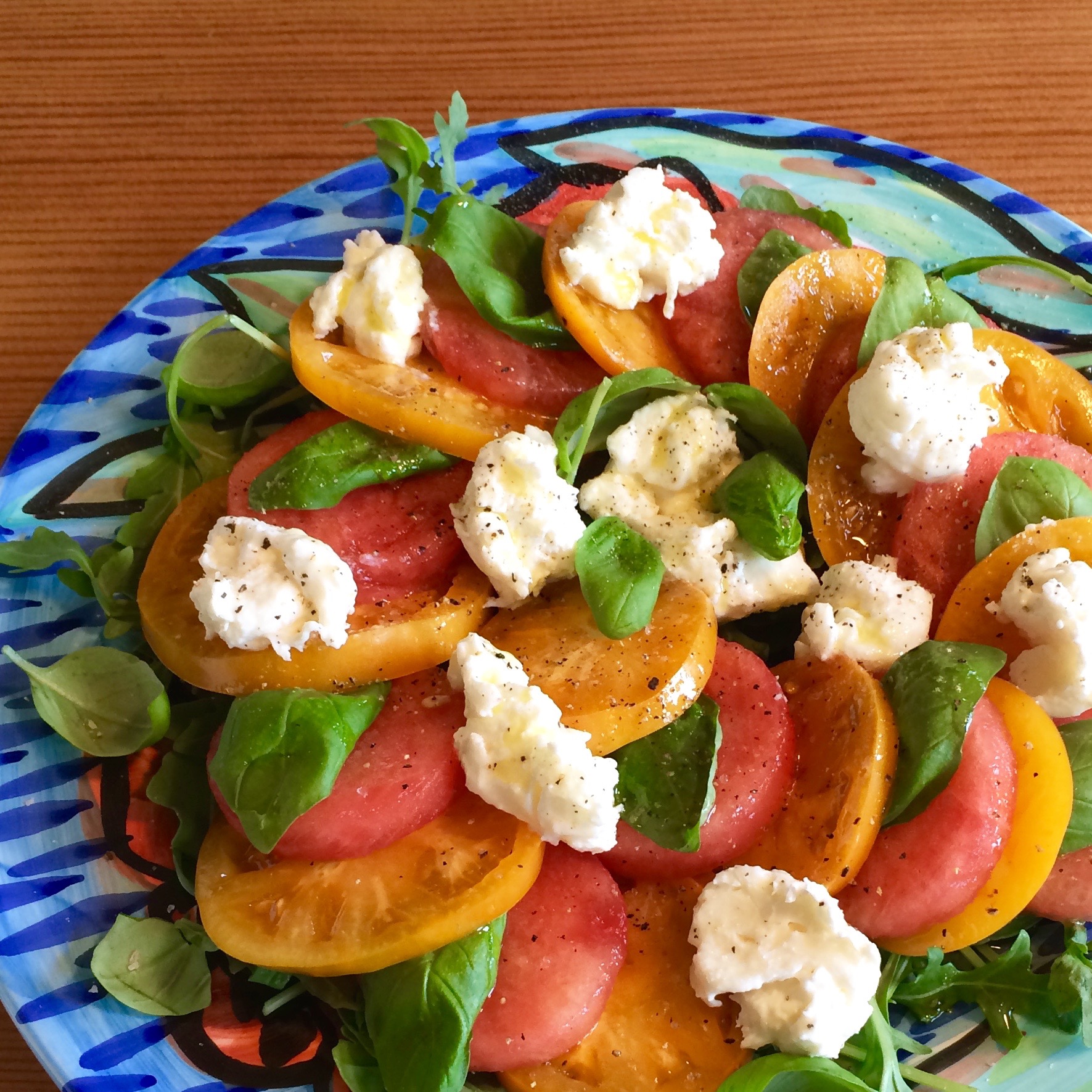 This summer I started playing with the idea of switching out the mozzarella with another vegetable or fruit. Using thinly sliced watermelon in place of the white cheese, makes a delectable, fresh & summery salad. When a bit of Burrata is scattered over the top, it becomes a great summer version of Caprese. I use yellow or orange beefsteak type tomatoes, with dense interiors that have lots of flesh (mesocarp) with many small seed pockets. These contrast beautifully with the pink watermelon, reminding me of summer sunsets.