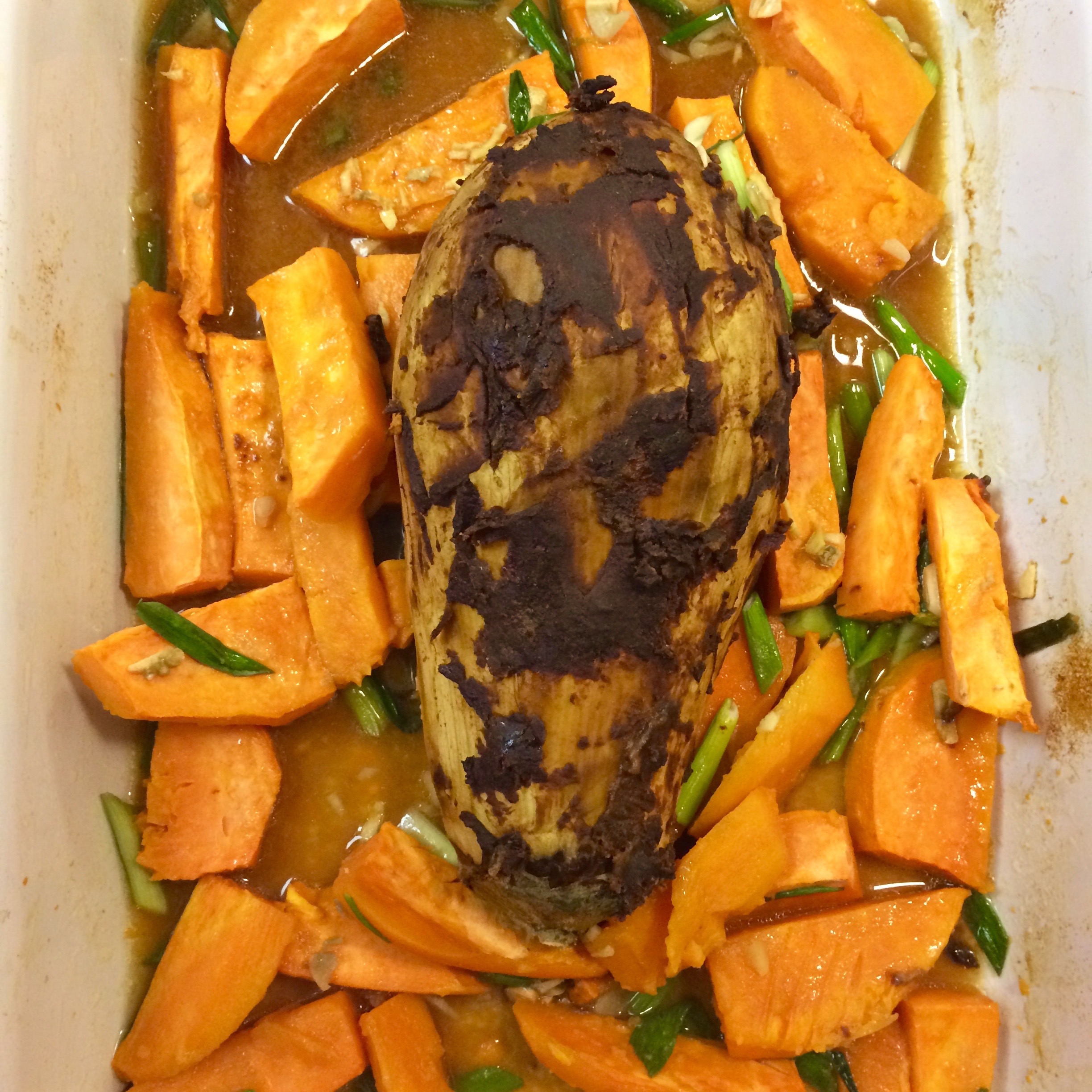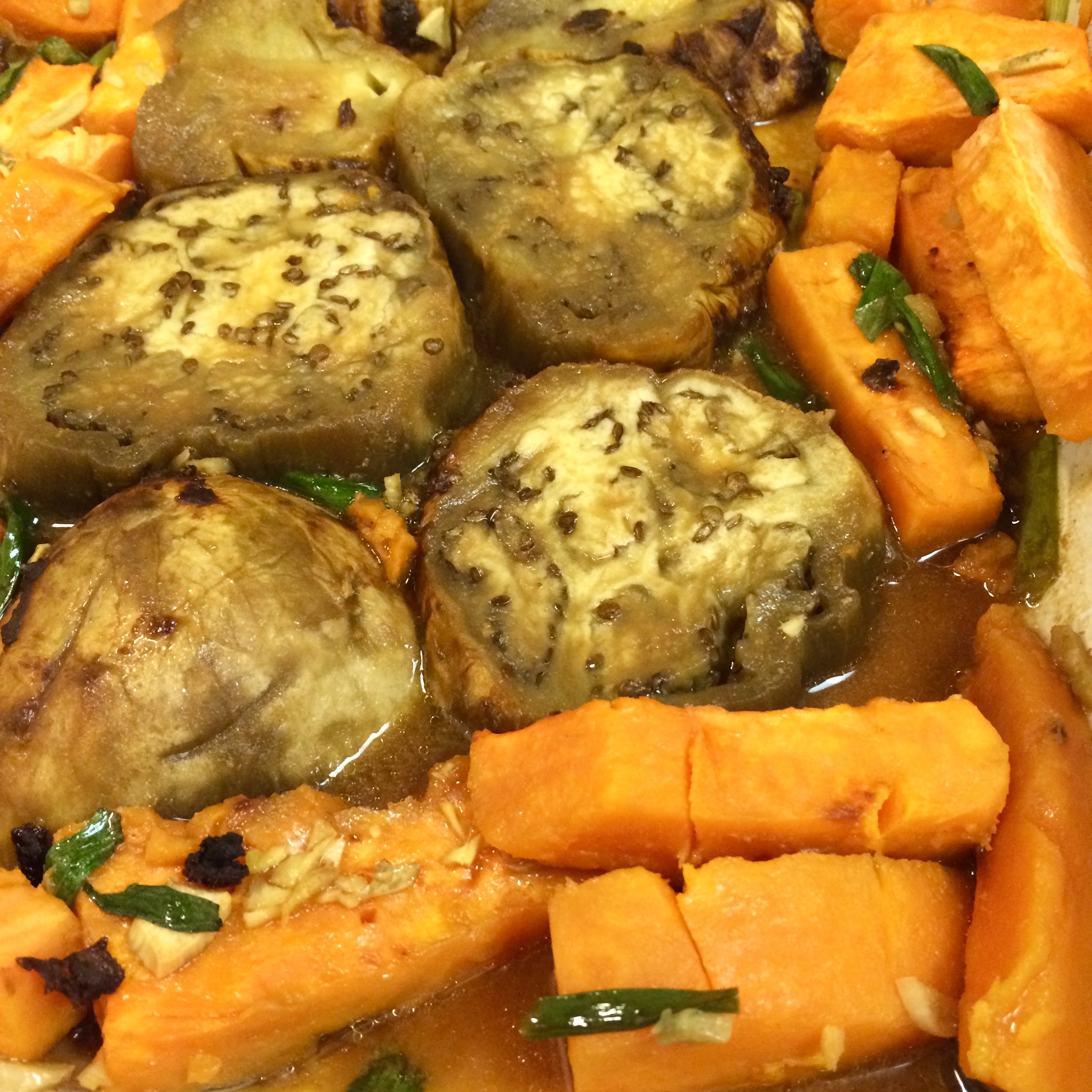 To finish: slice the eggplant crosswise into fairly thick steaks, about 1”, and nestle into the yams & stock.