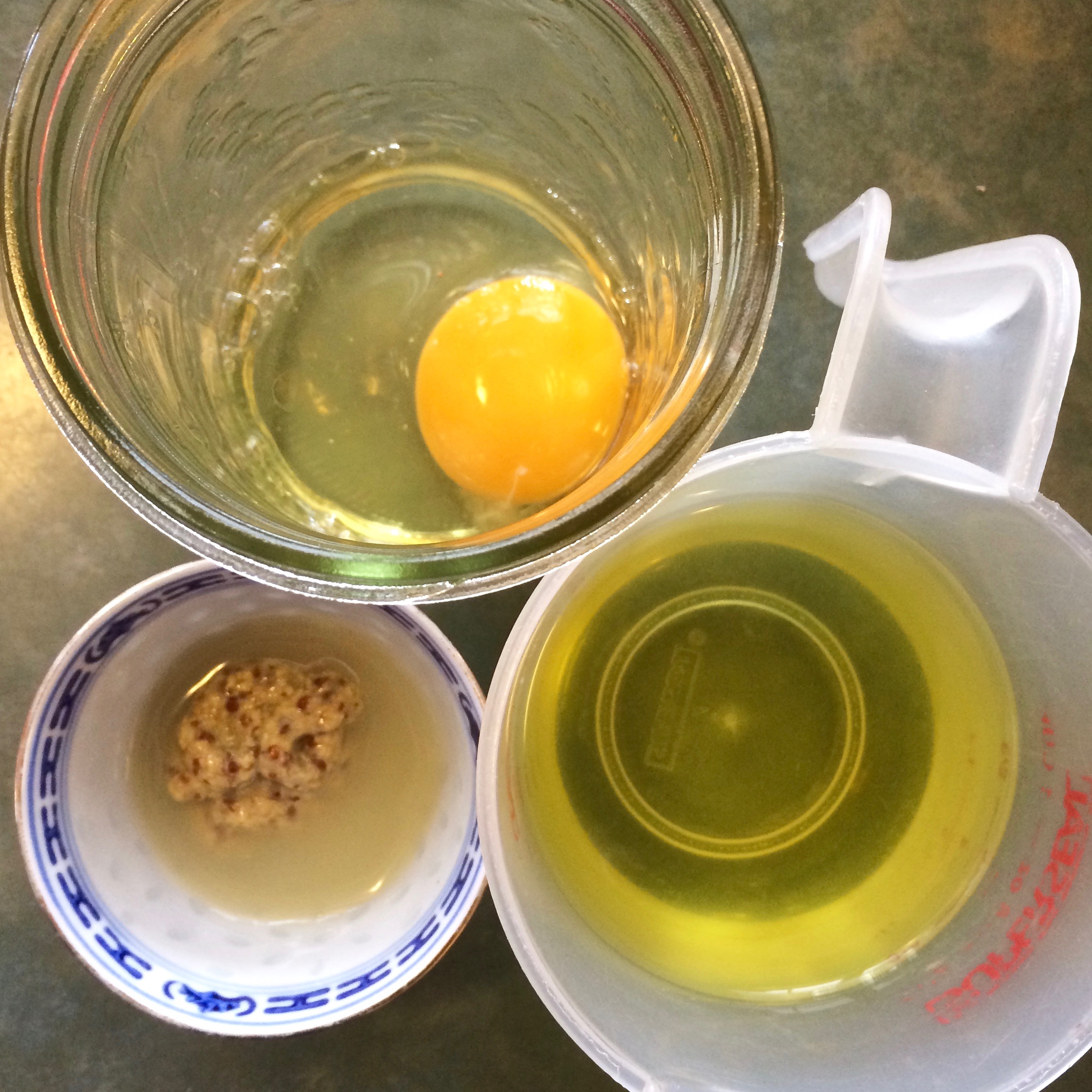 Put the egg, Dijon, lemon juice (or vinegar), and salt in a 500 ml canning jar.