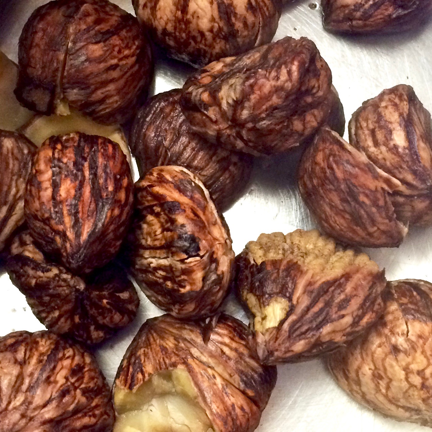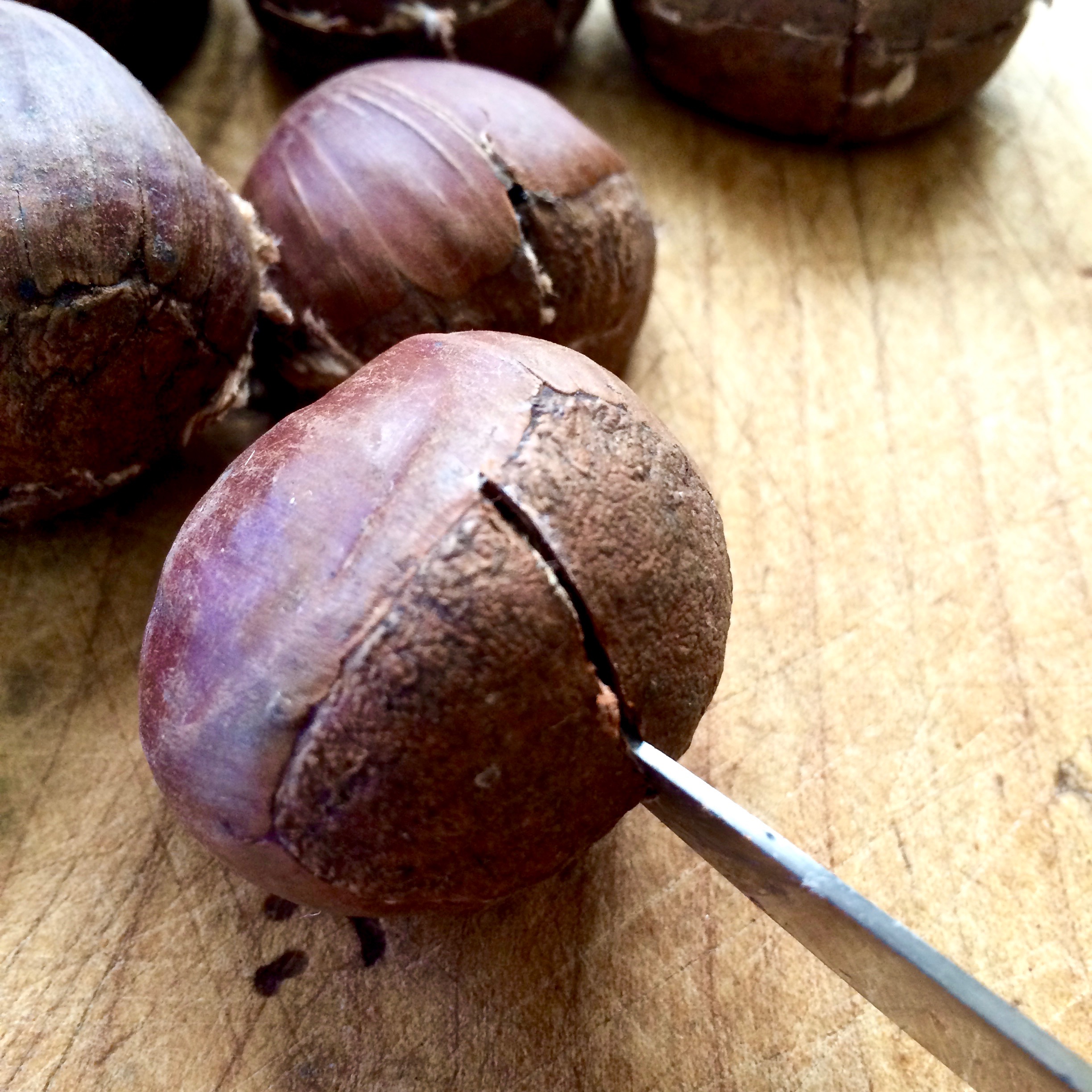 Peeling the chestnuts: there are many ways to do this, but essentially cut the outer shell, and either steam or boil them for 8 minutes or so. Peel off the shell, and slip off the skins. If the skins aren’t ready to slip off, cook them a couple of minutes longer. Any resistant bits can simply be pared off.
