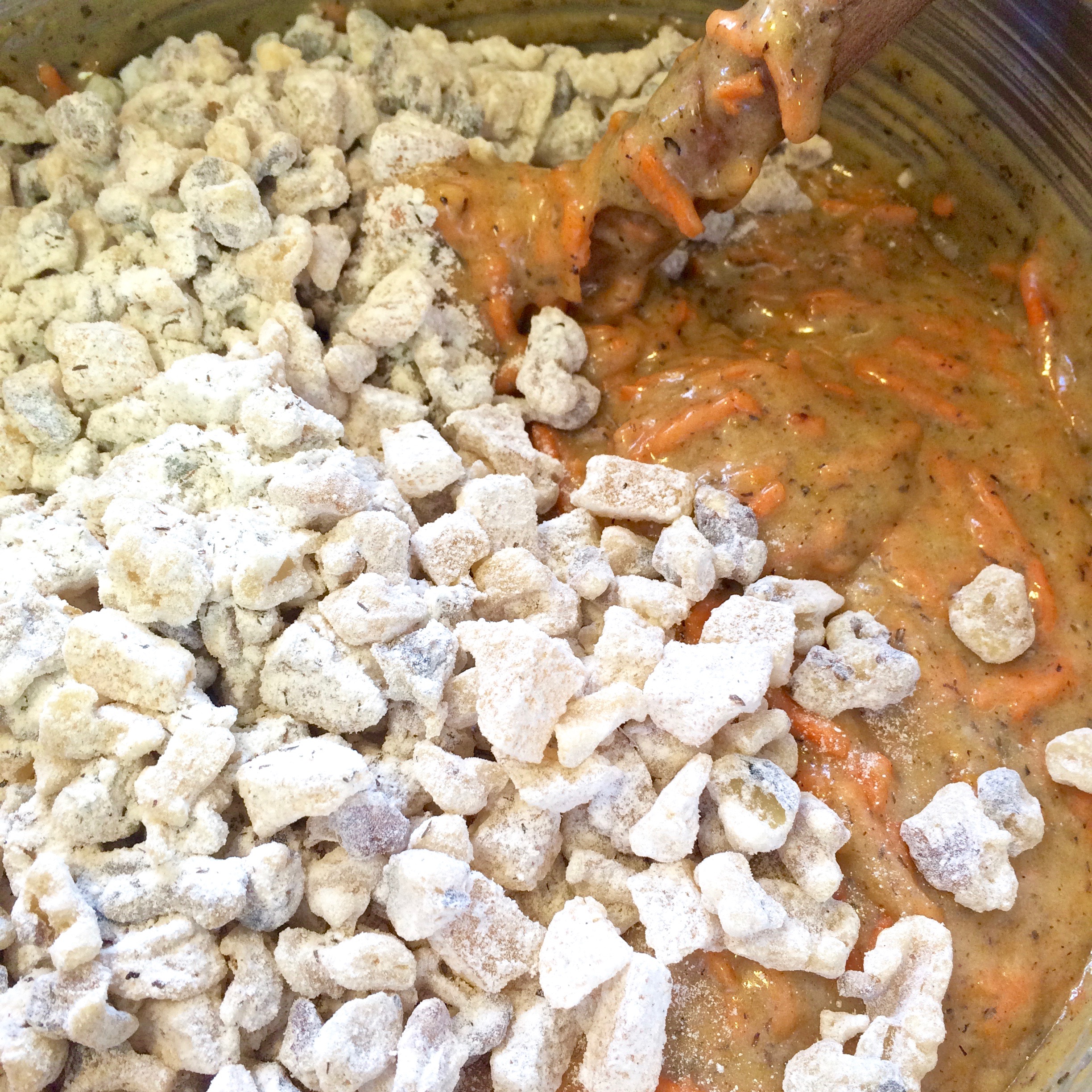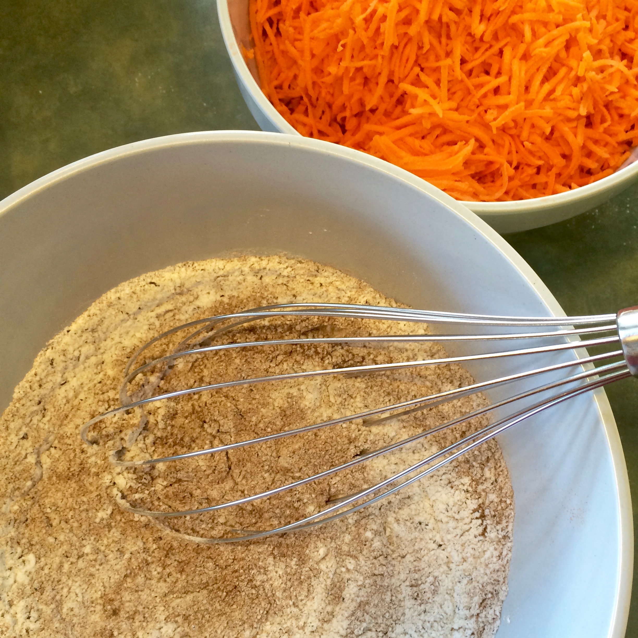 Fold in the dry ingredients, followed by the carrots, and lastly the ginger & walnuts.IMG_1742