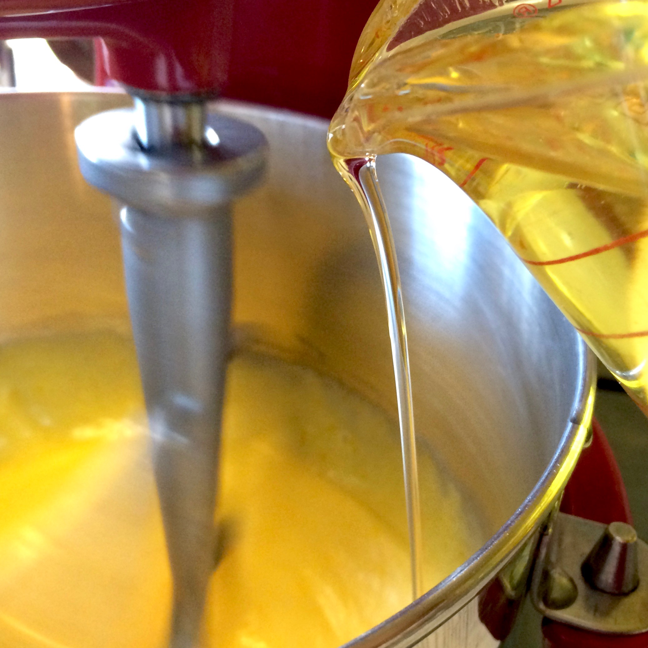 Gently add in the oil & vanilla with the beaters still running on medium.IMG_1741