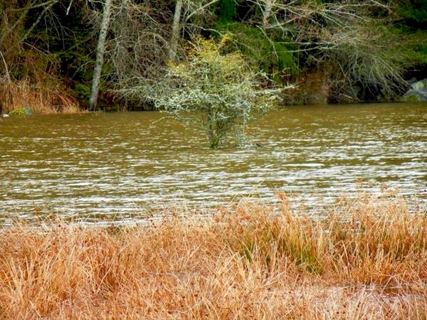 We waited until the waters had receded somewhat from the valley bottom, and got across into the cliff bottom. Climbing up, we found that the property line that is way up the slope had been re-surveyed. Our only guess is that the surveyors had broken through our carefully piled stacks to work the line, creating an access point for the cows. We ran ropes all the way down the hillside, tied from tree to tree; at about waist height over bases of dead fir & cedar, and wove branches and reworked stacks all the way to the top.