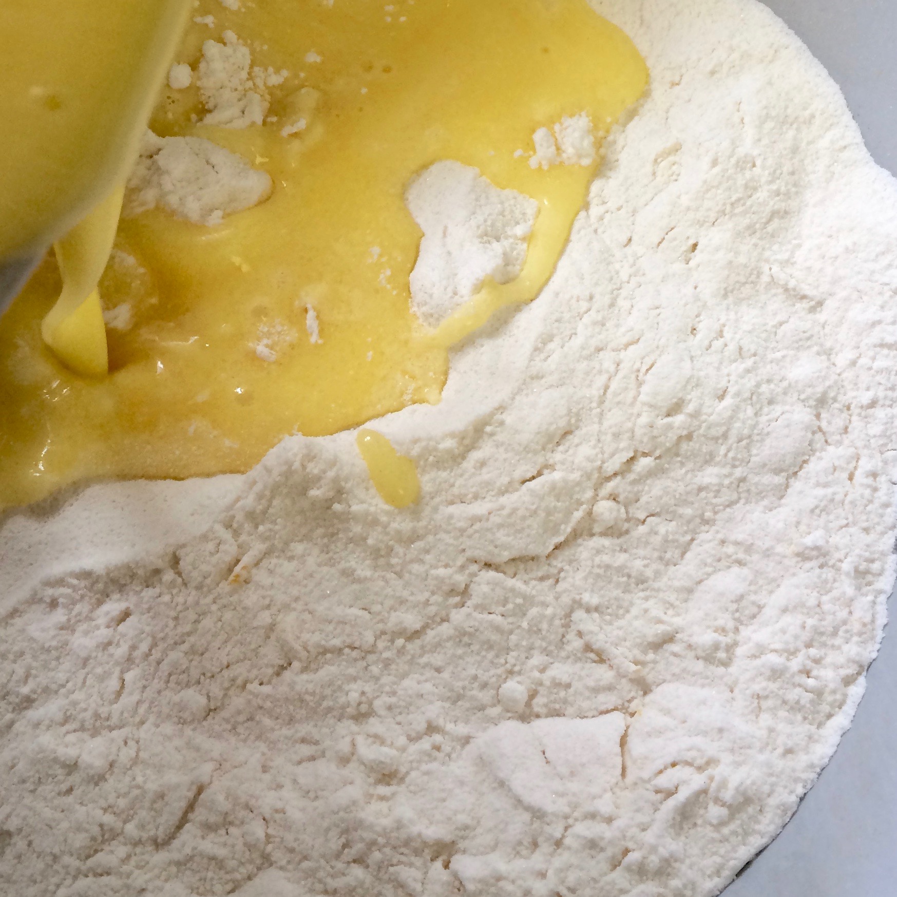 Add the liquid ingredients to the dry ingredients, mixing well with a sturdy wooden spoon.