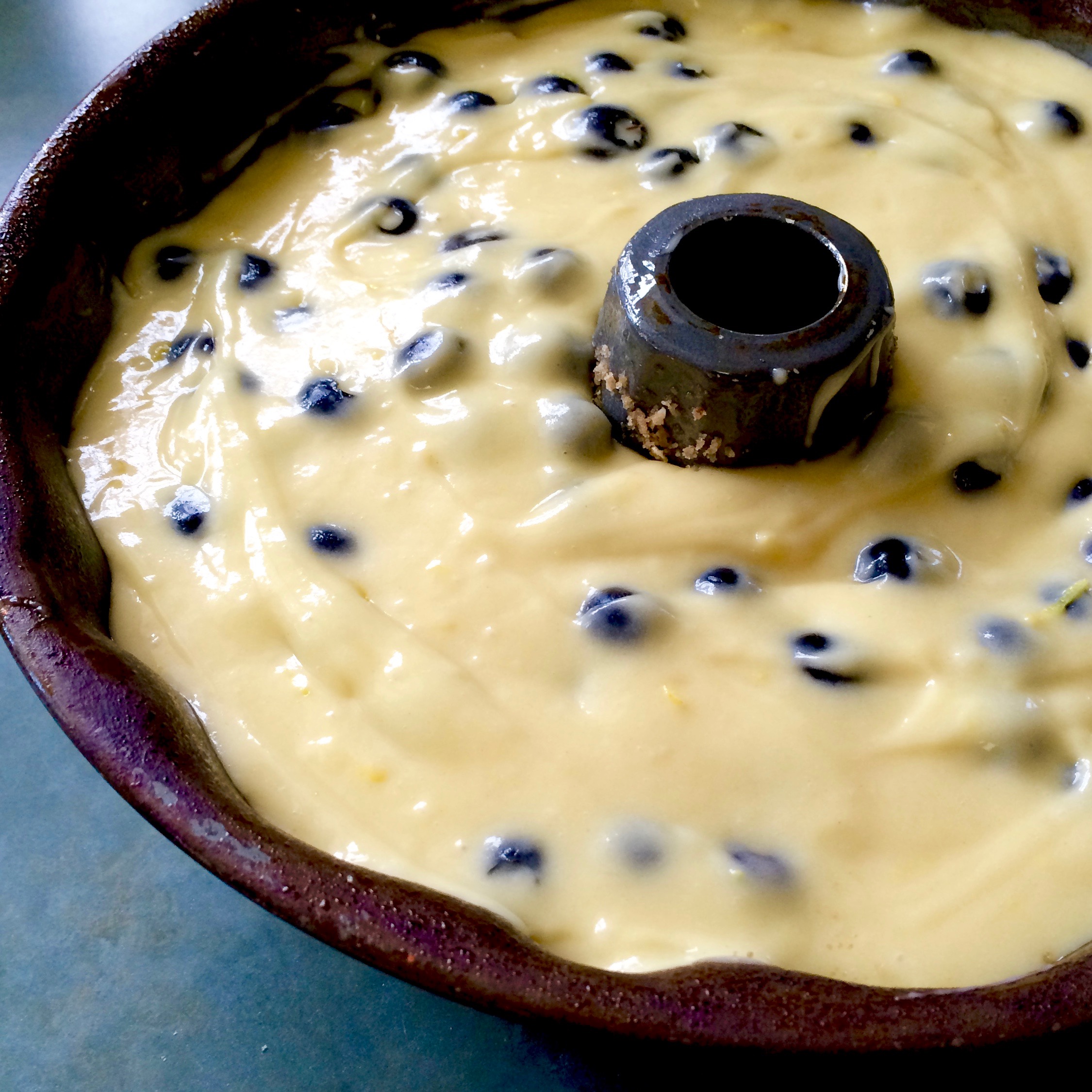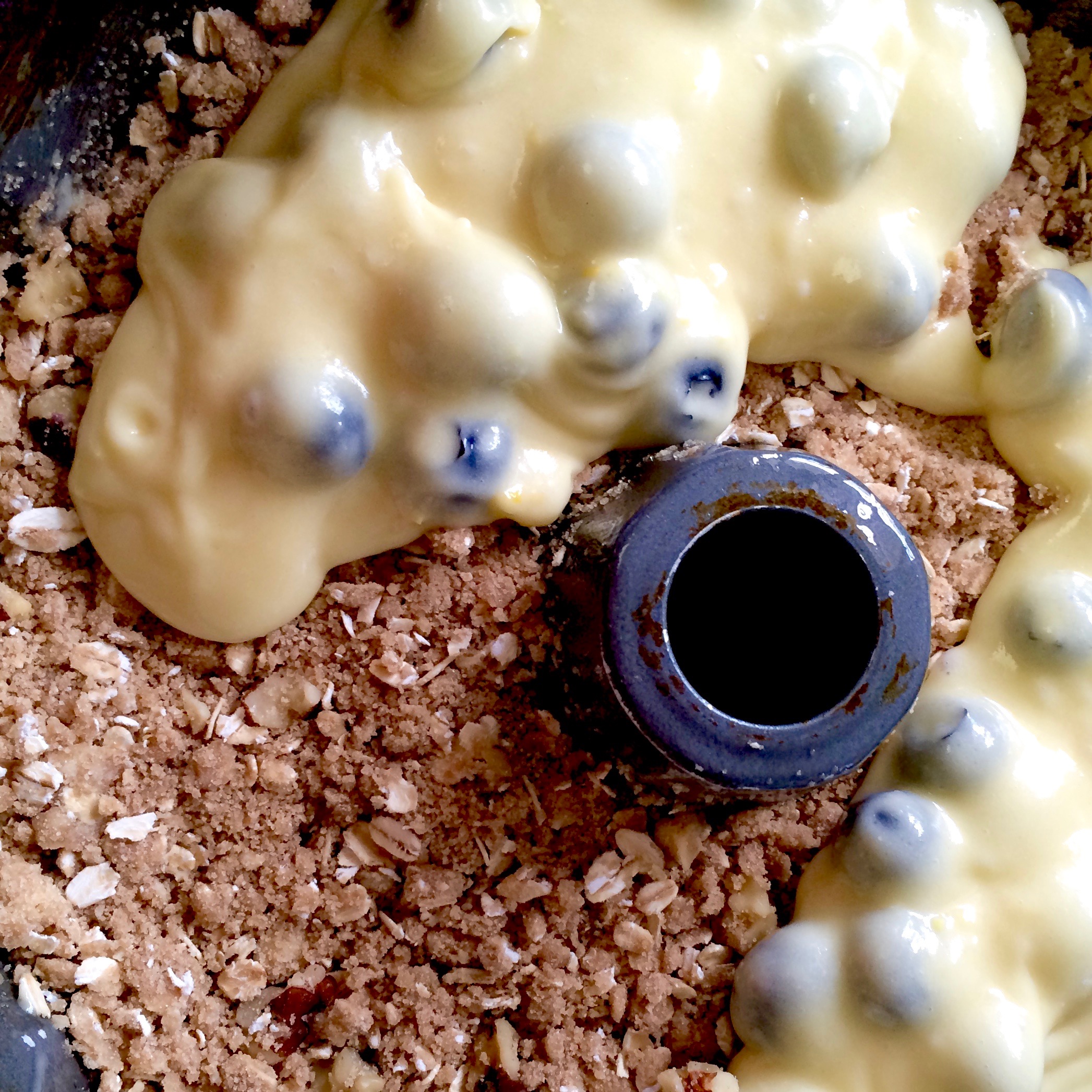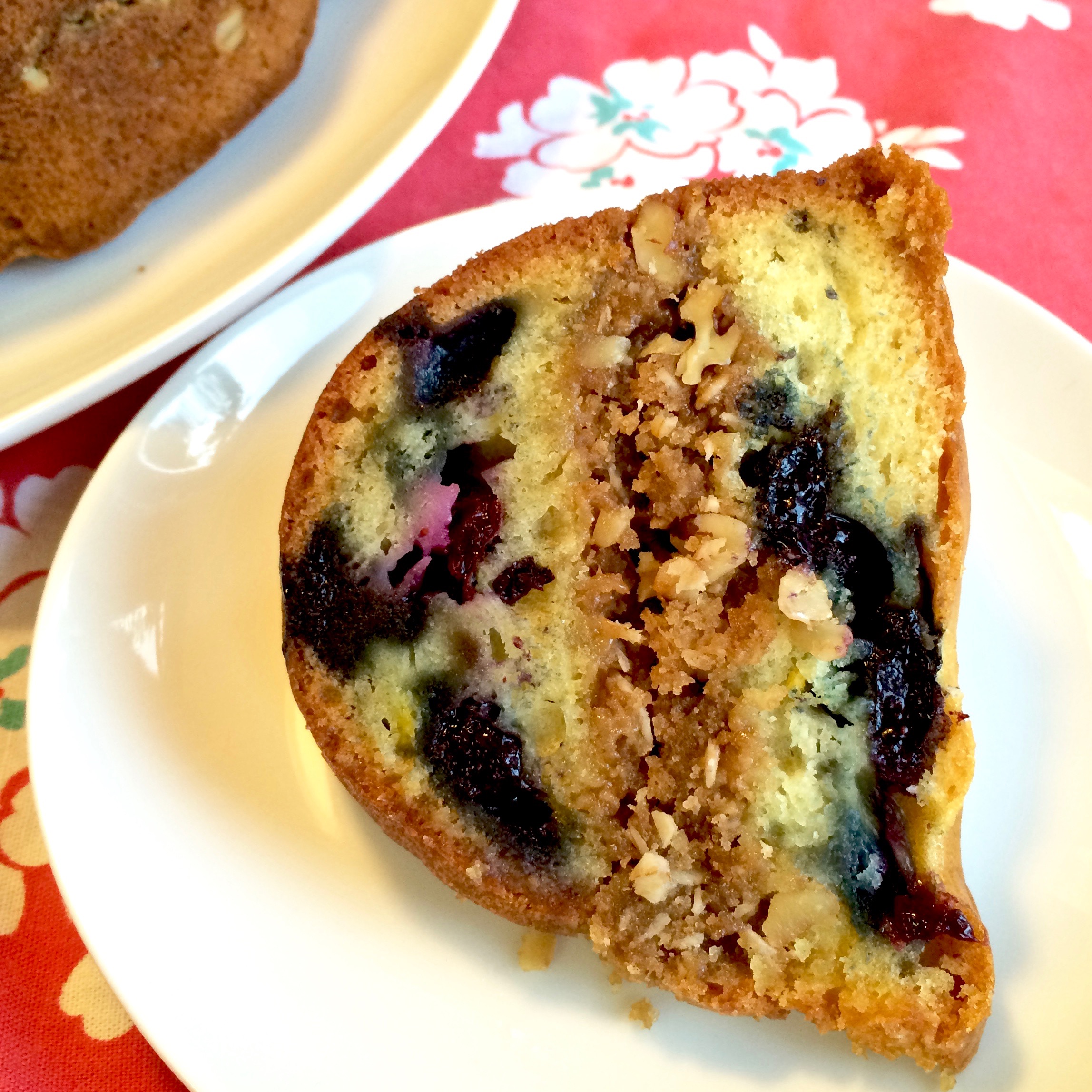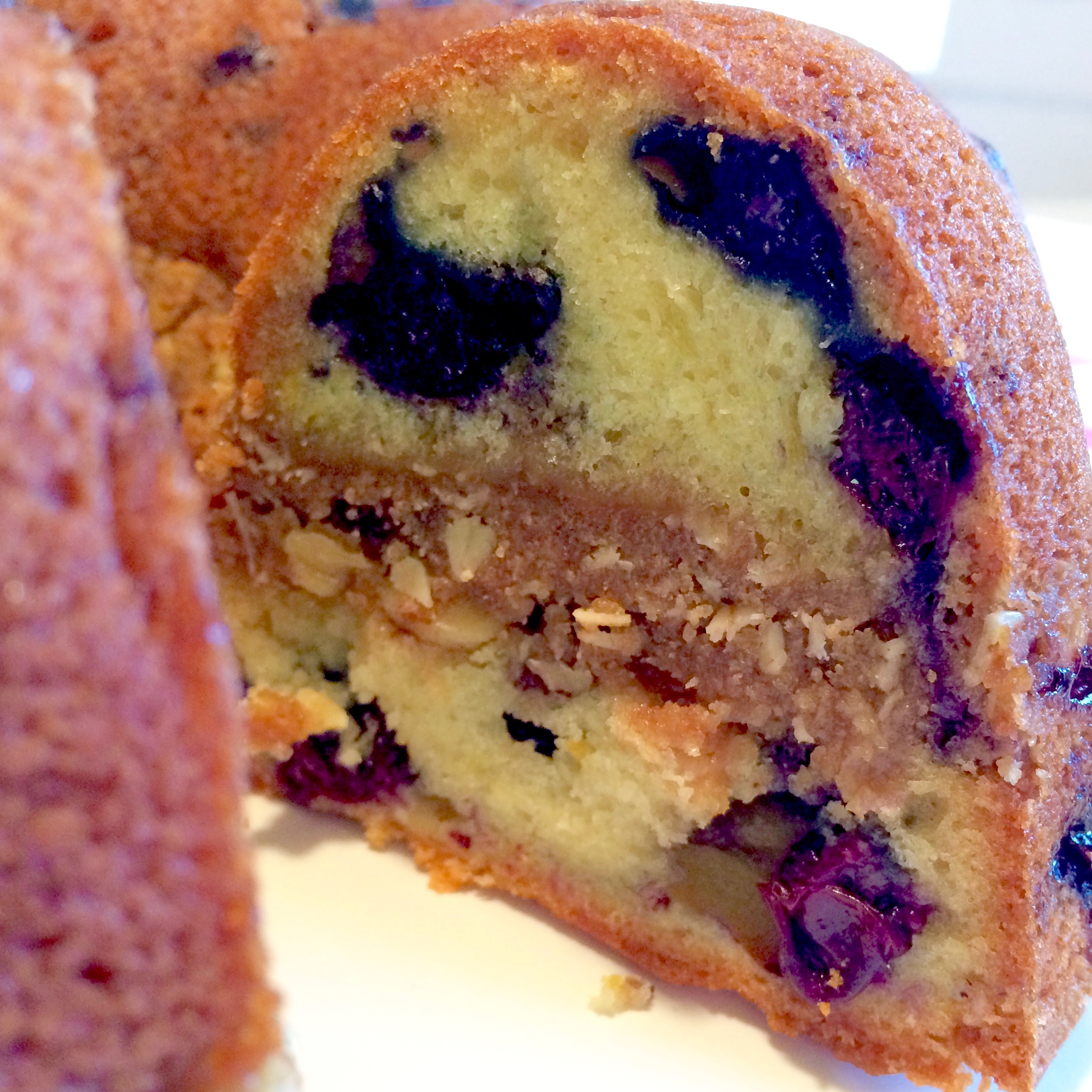 Sometime a few decades ago I started making Bundt cakes. I never really understood the appeal until this cake. It started with making a simple lemon blueberry cake with a streusel mix going in the pan first, so when it was removed from the pan there would be a crispy topping built in. But never being one to leave good enough alone, I thought the streusel could simply go in the middle, making the cake come clean from the pan, not leaving chunks of streusel littering the counter. Having it in the middle gives the cake a wonderfully buttery crunch in the center of each slice.